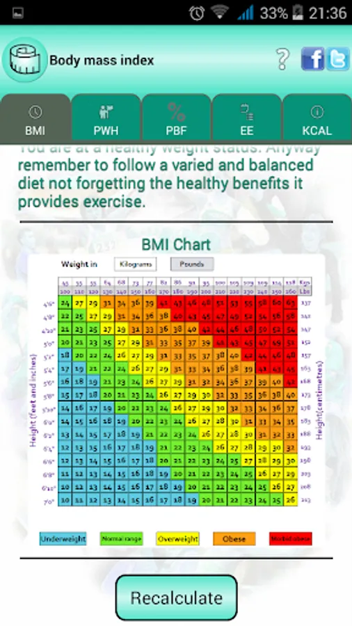 This application is a BMI calculator (Body Mass Index), PCA (Body Fat Percentage), PCA (Percentage waist height) and GE (energy expenditure or caloric intake). You can calculate your BMI and your waist-height index to determine your ideal weight based on age and gender. Also check na list of all the foods with their corresponding calories.