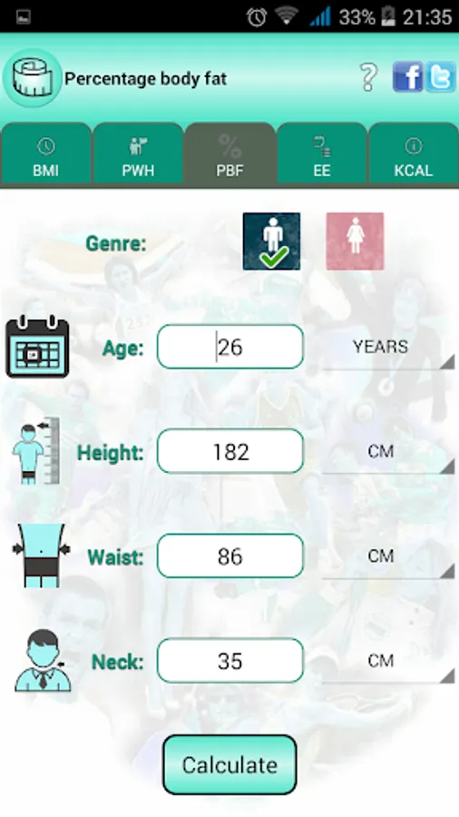 • Percentage of body fat: is defined as the weight of fat divided by the total weight. It is estimated with the so-called "circle method" that uses the height and waist circumference, neck and hips.