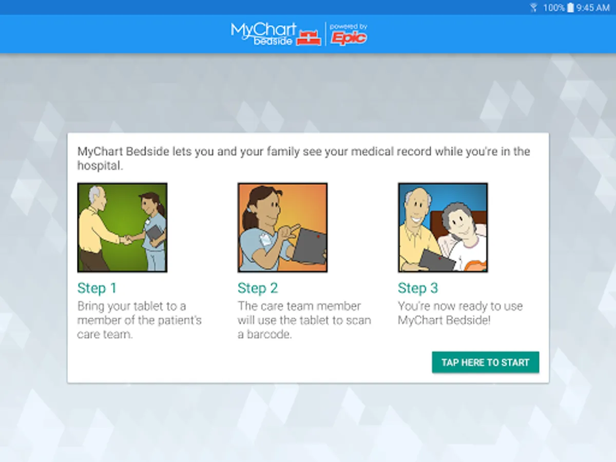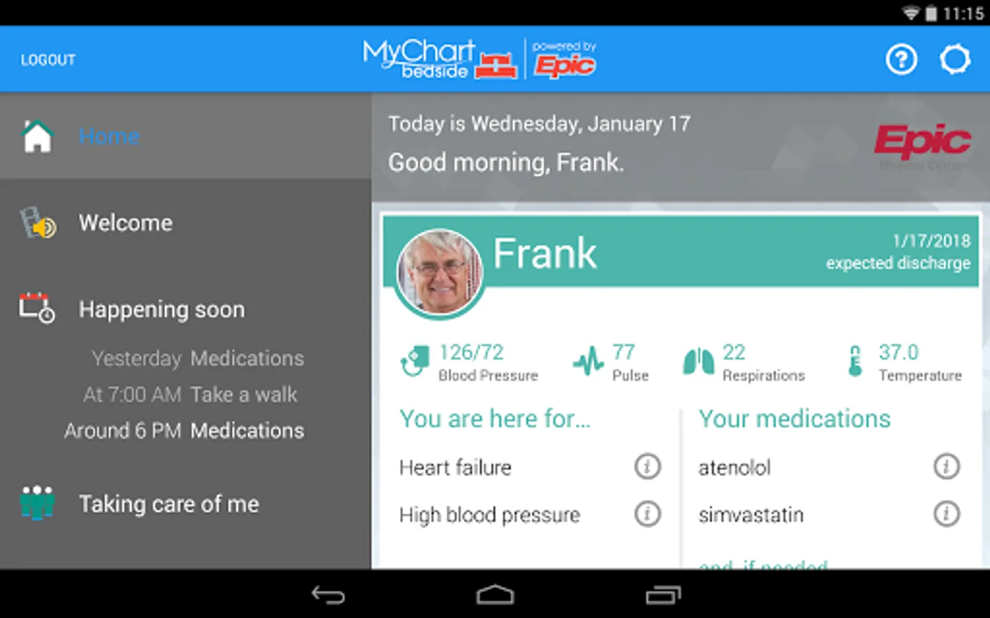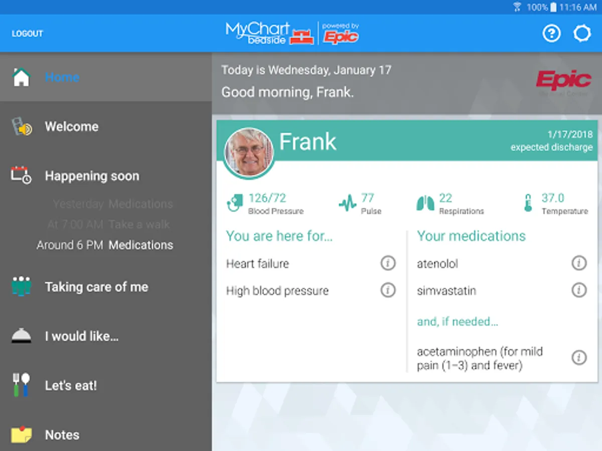 • Bedside for tablet: give yourself the complete Bedside experience on an iOS or Android tablet, including features for contributing documentation and communicating with the care team. This application requires a hospital-provided or personal tablet.
