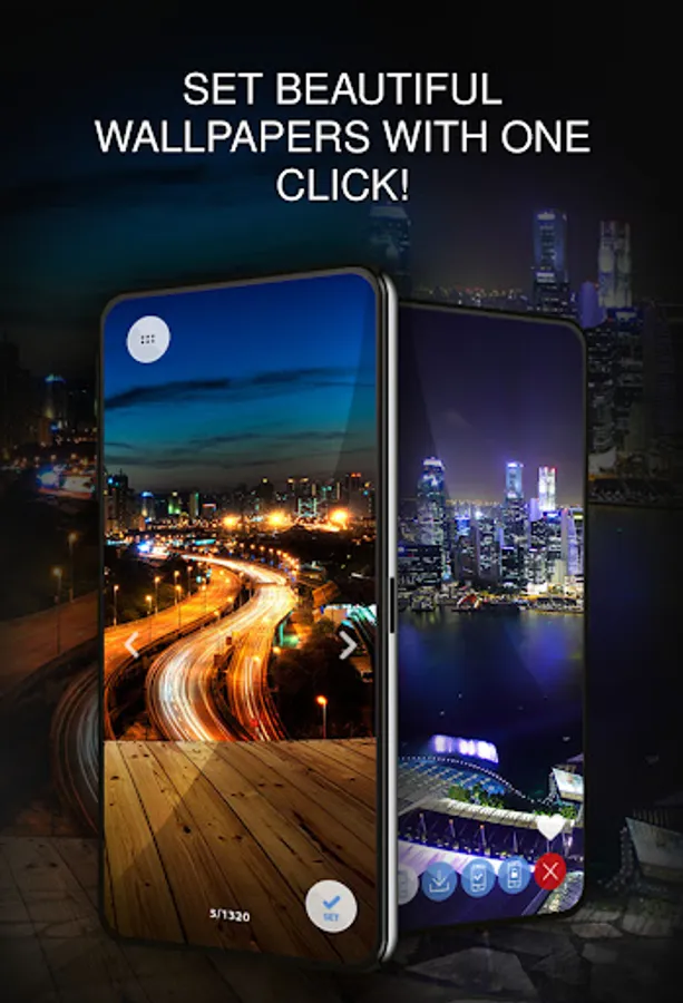 One step will allow you to create a stylish image of the city at night on the screen of your smartphone, tablet or set a screen lock from the city at night on the same devices. Find your favorite wallpaper, click "Set on screen" and the application will do everything for you! Our system of automatic matching wallpaper to the phone. The application will recognize and automatically adjust the wallpaper image to the screen resolution.
