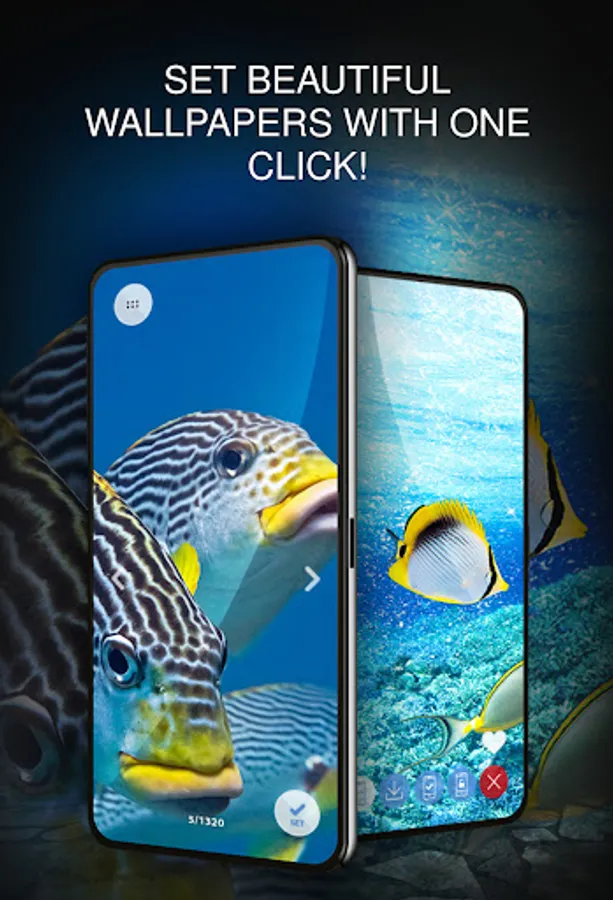 One step allows you to create a stylish image of fish on the screen of your smartphone. Find your favorite wallpaper, click "Set on screen", the application will do everything for you! Our system of matching wallpapers for your phone. The application recognizes and automatically adapts the wallpaper image to the screen application.