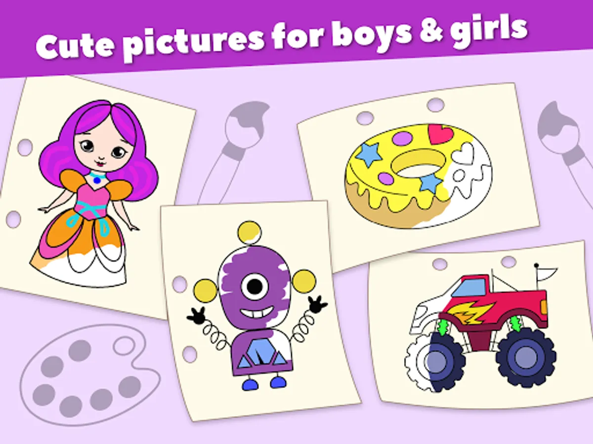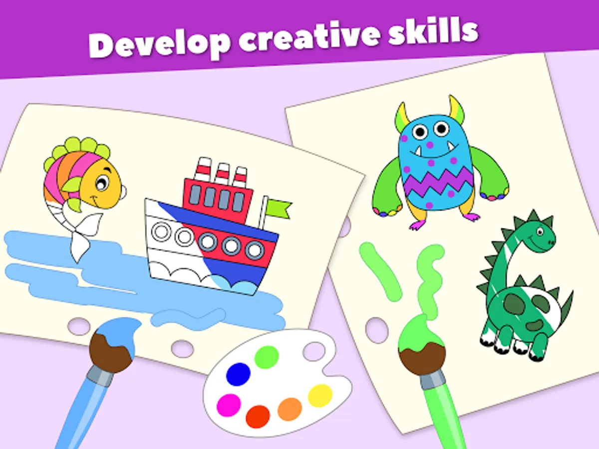 Painting Games for Kids is a draw pad game where pictures will be interesting for both - boys and girls of preschool age. Baby Drawing have coloring pages with dinosaurs, animals, monsters, and other characters will touch everyone's feelings. Kids Paint contains special princess category for girls and cars for boys.
