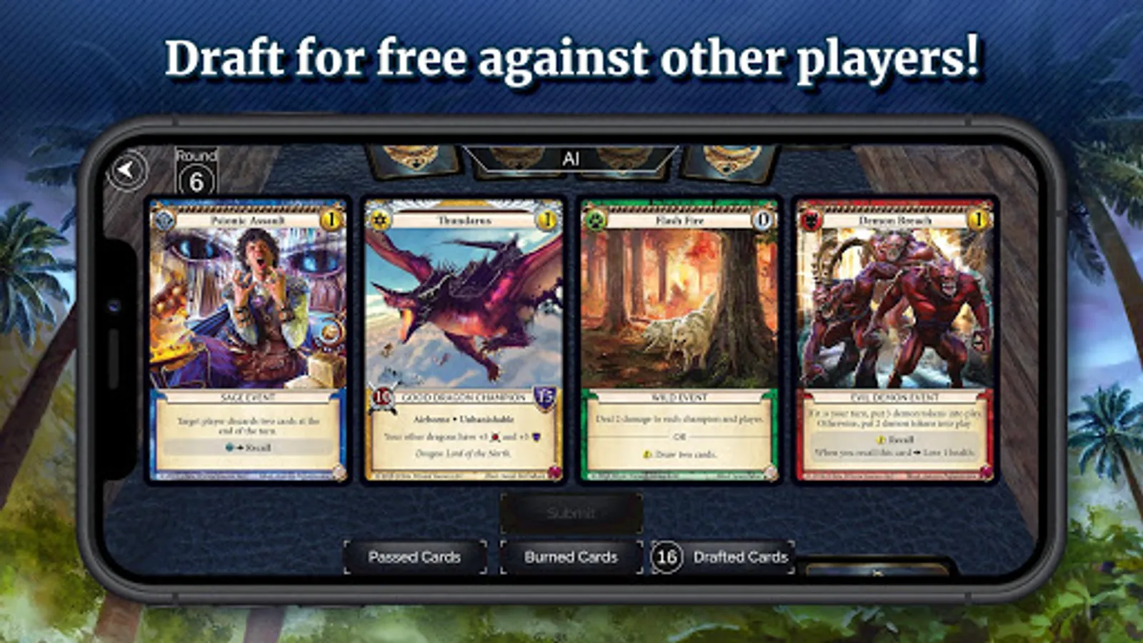 Epic Card Game is a strategy card game, where you summon champions and use events to try and defeat your opponent. There are many ways to play Epic – a different game every time you play! Supported in the app are Sealed, Dark Draft, Preconstructed, and Full Constructed. There is also Campaign mode, where you try to defeat as many opponents as possible, all while building a better and better deck of cards as you progress through the Epic landscape. For more formats, check out the physical game that the app was based on.