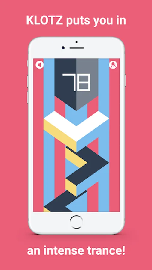 Elevating blocks - they call themselves KLOTZs - must be turned by tapping so they don´t crash with the gray tower at the top of the screen. Increasing speed, changing color palettes and animated backgrounds make it more and more difficult to reach a new highscore. KLOTZ puts you in an intense trance!