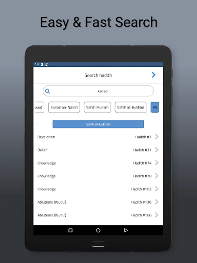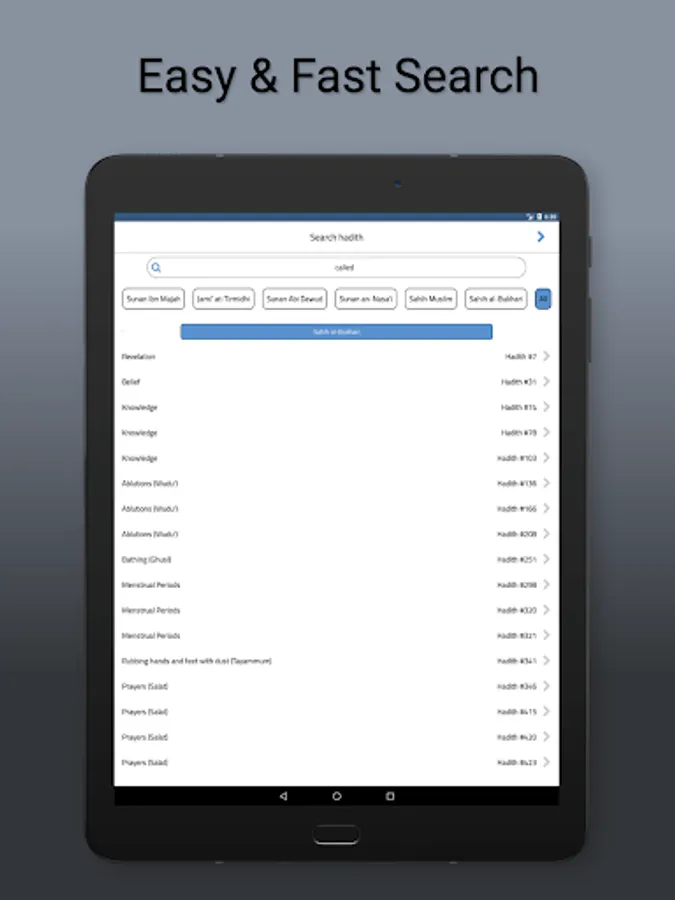 • Easy and fast search in some or all hadith books.