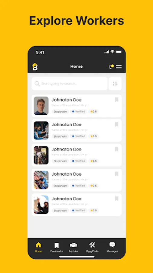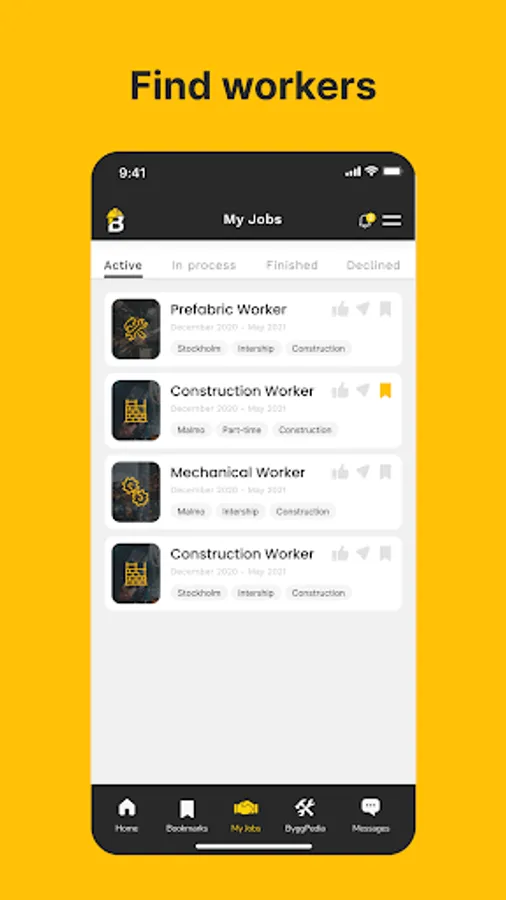 ● Branding and Favorites — Save your favorite Candidates with a single tap to request them for future projects, and build your brand on ByggJobs with our customer branding system that allows you to promote your organization by seamlessly displaying your custom-made banners in the feed shown to Candidates.