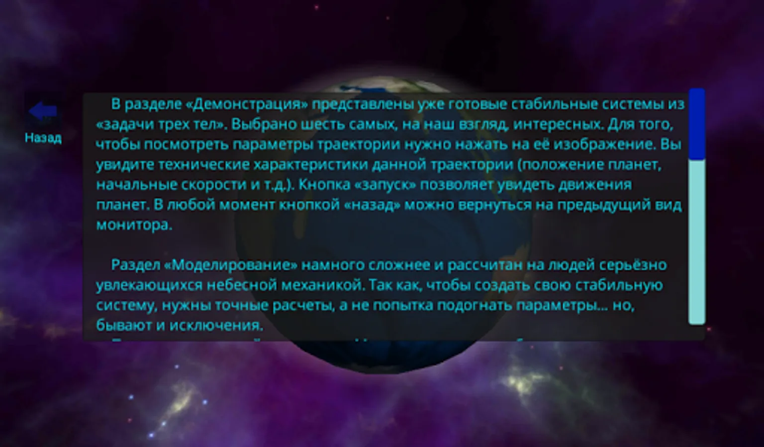 It is the second part of the program, I assume, will use high school students, students of astronomy and celestial mechanics departments. I think there is a certain uniqueness of the project - such programs are not in the public domain (perhaps on highly specialized departments), and that the knowledge that modern students prefer a good tablet laptop - my project work as well as on Microsoft Windows, and OS Android . It leaves no work to do and the MAC, but as the program is completely free, does not see any reason to invest money there.