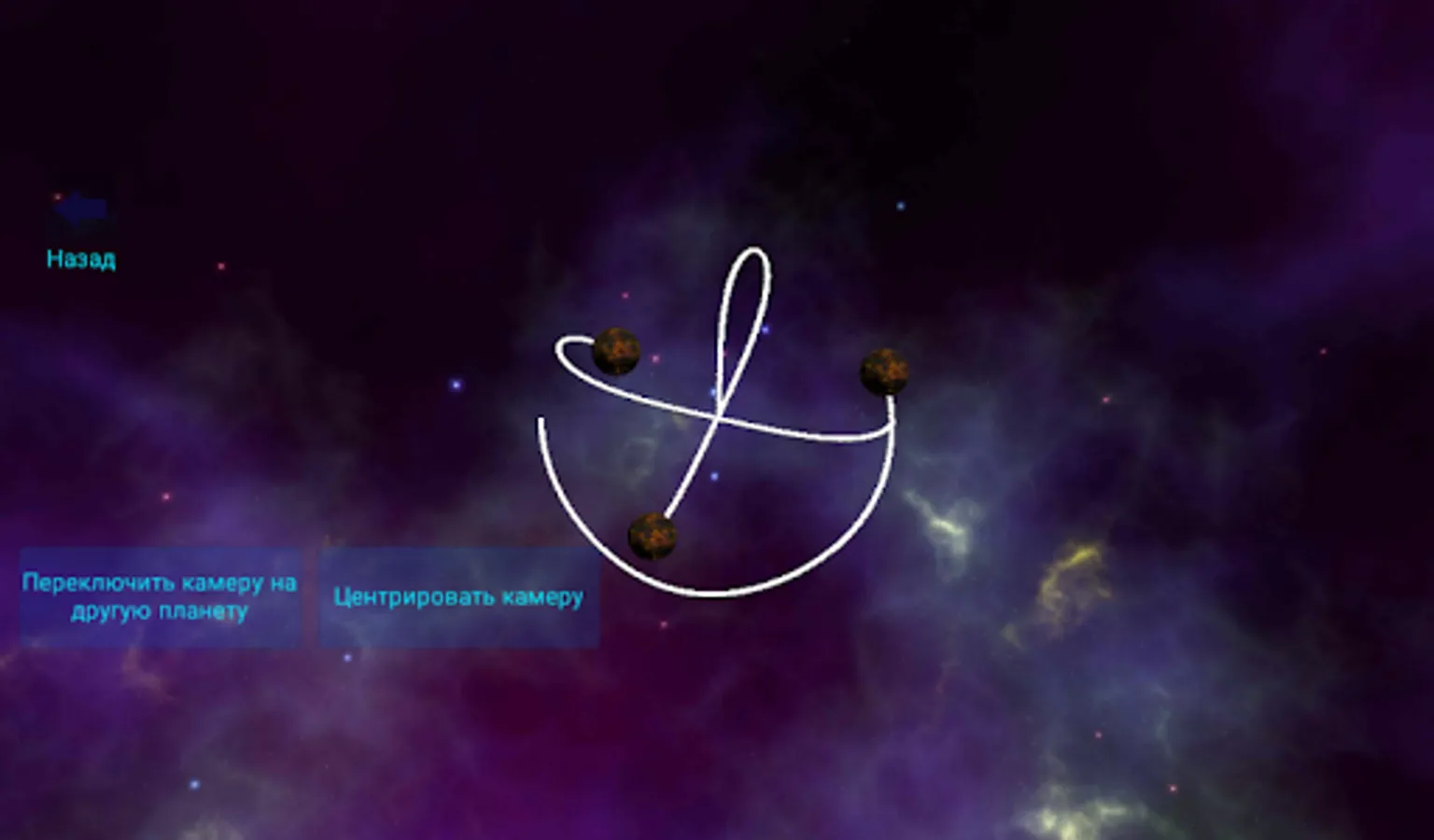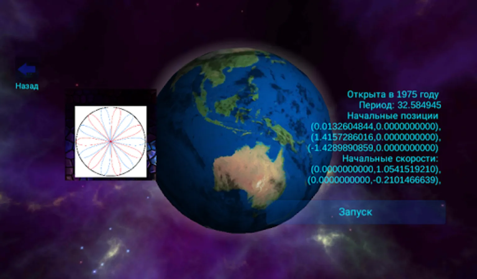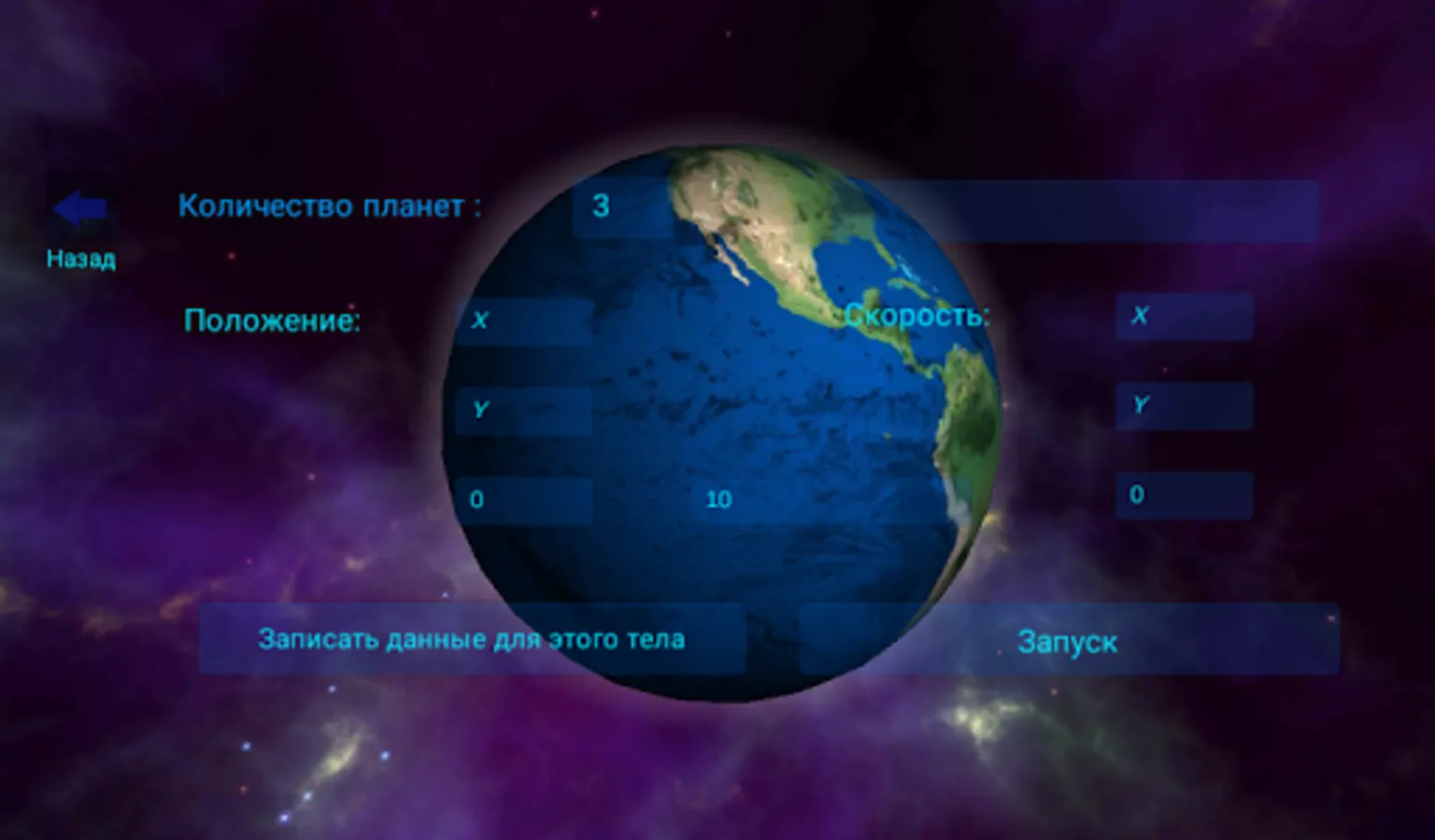 Guide section too application Details (+ site developer) ... Briefly - enter the number of planets, and then for each 7 prescribes parameters (coordinates x, y, z, Velocity x, y, z and the body weight). Save data for each of the planet! All entered - click "start".