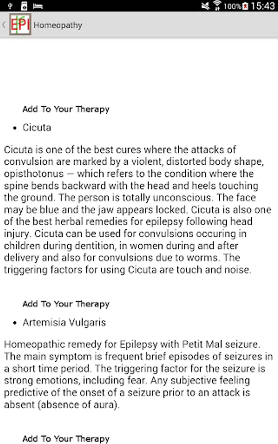 Finally, tap on Your Therapy. You will see a list of symptoms (in orange) mixed with a list of remedies (green) that you have selected. Taken together, the symptoms and the remedies form your therapy. Now all you have to do is obtain the remedies and start the process of eventual improvement of your health.