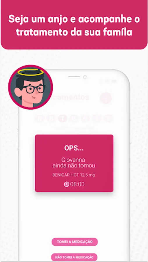 - Ingesta report: follow your performance with your angels using the app, how many medications you took at the exact time, how many you took late, how many times you couldn't take it.