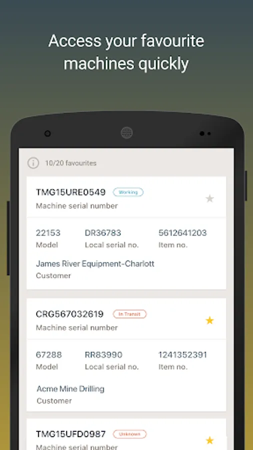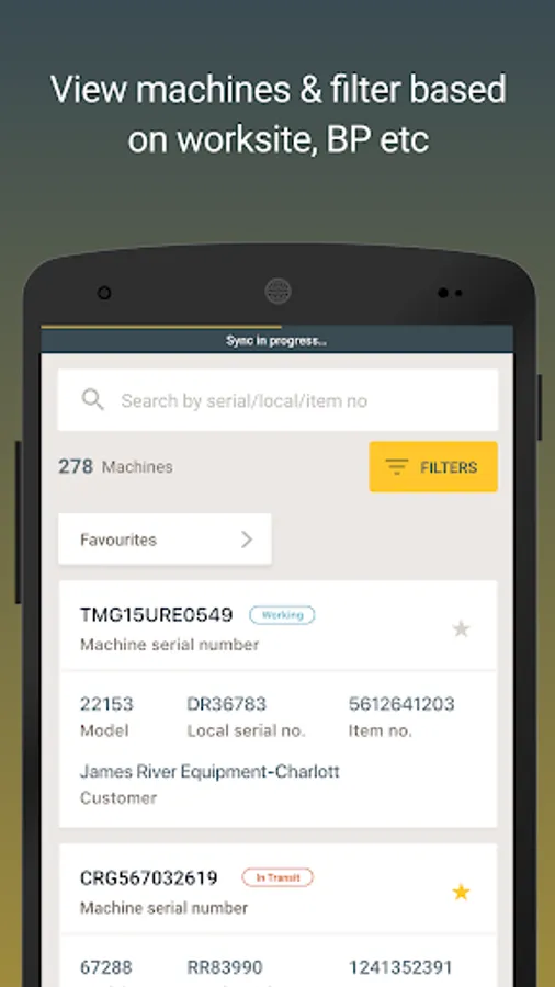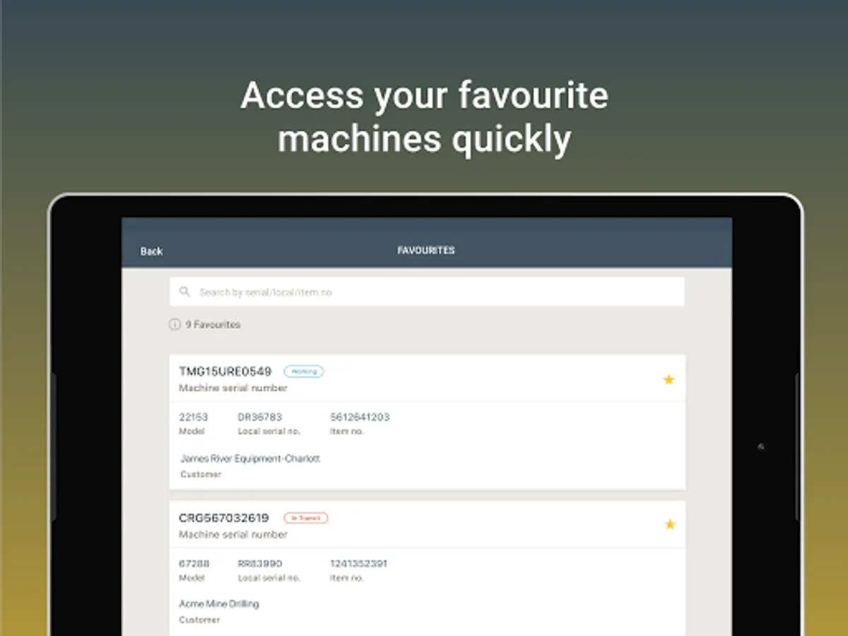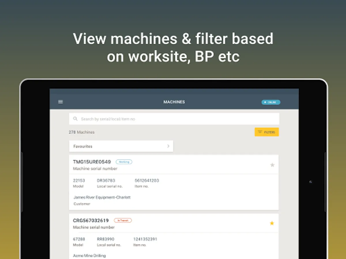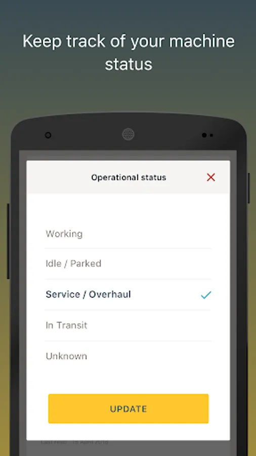 • Update and track key metrics of your Machine (operational status, Hour counters, location etc.)