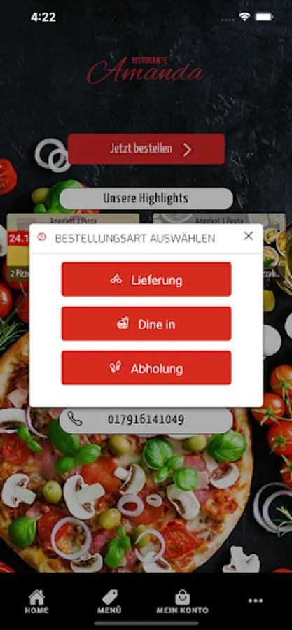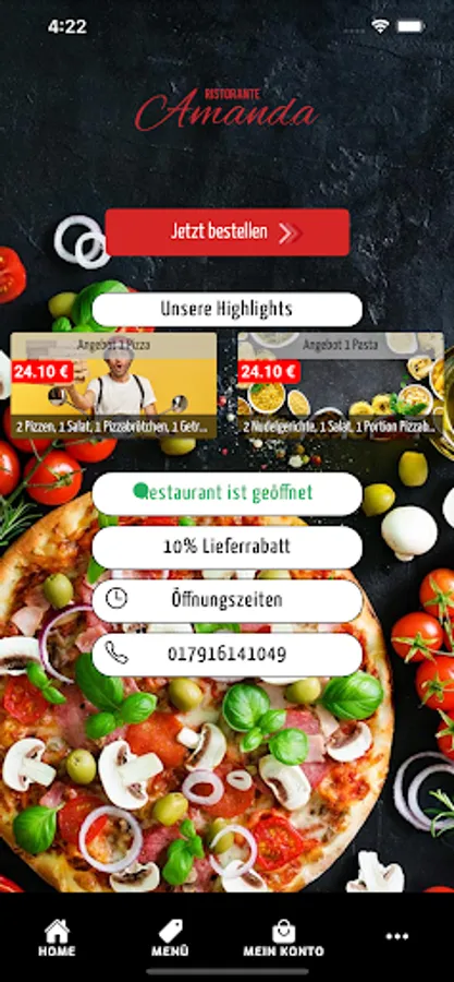 Welcome to Ristorante Amanda in Bottrop. We serve our customers with pizza, burgers, Indian and more dishes and have been doing it with passion for several years. We are always happy to bring new customers closer to our origins and would like to give them the opportunity to place their order in an uncomplicated and totally simple manner. For this reason, we would like to introduce you to our new app and our online shop, with which you can easily pay via Paypal, cash and credit card.