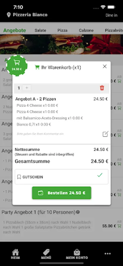 Welcome to Pizzeria Bianco in Recklinghausen. We serve our customers with pasta, pizza and schnitzel dishes and have been doing it with passion for several years. We are always happy to bring new customers closer to our origins and would like to give them the opportunity to place their order in an uncomplicated and totally simple manner. For this reason, we would like to introduce you to our new app and our online shop, with which you can easily pay via Paypal, cash and credit card.