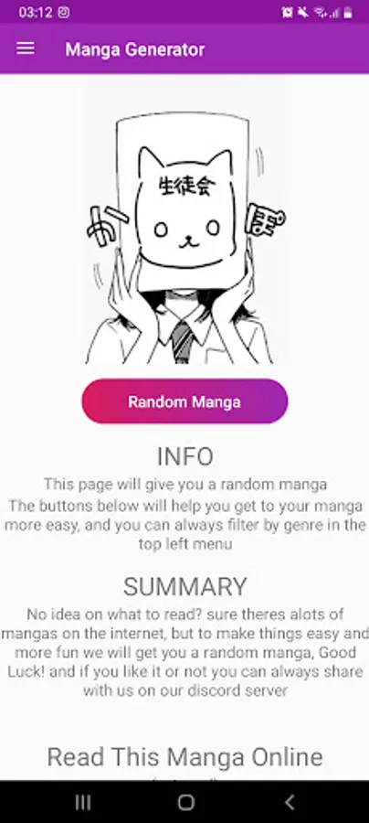No idea on what to read? sure theres alots of mangas on the internet, but to make things easy and more fun we will get you a random manga, Good Luck! and if you like it or not you can always share with us on our discord server