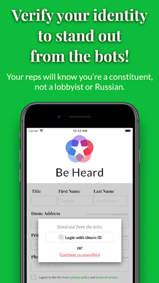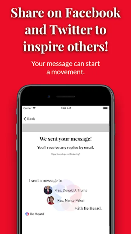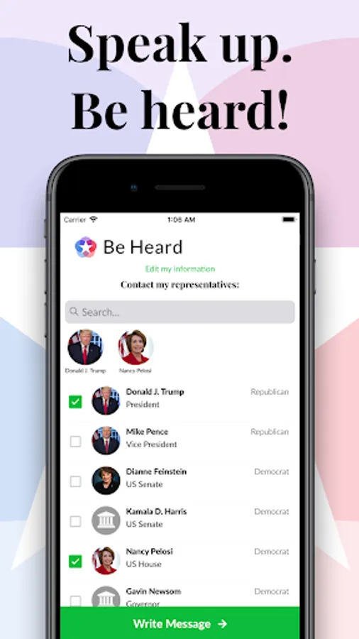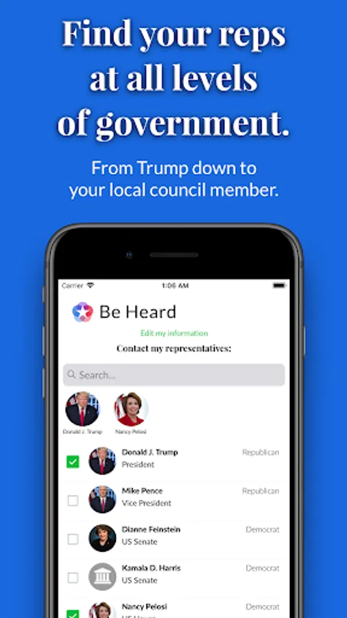 NOTE: Be Heard is not affiliated with the U.S. government. This app makes it easy for you to contact government representatives, but we have no relationship with those representatives. Information displayed in the app is sourced from public records the openly available Google Civic Information API: https://developers.google.com/civic-information. We are a registered vendor with Communicating With Congress, an API Congress provides to let developers build civic engagement tools: https://www.house.gov/doing-business-with-the-house/communicating-with-congress-cwc