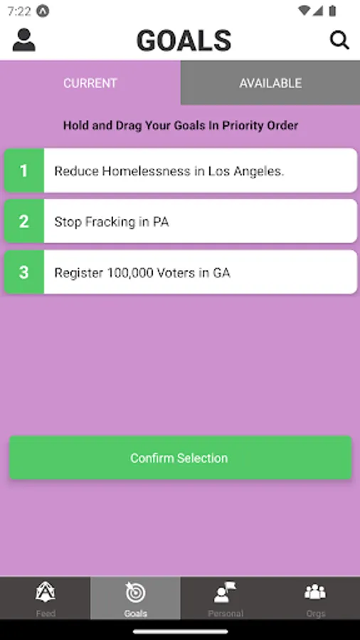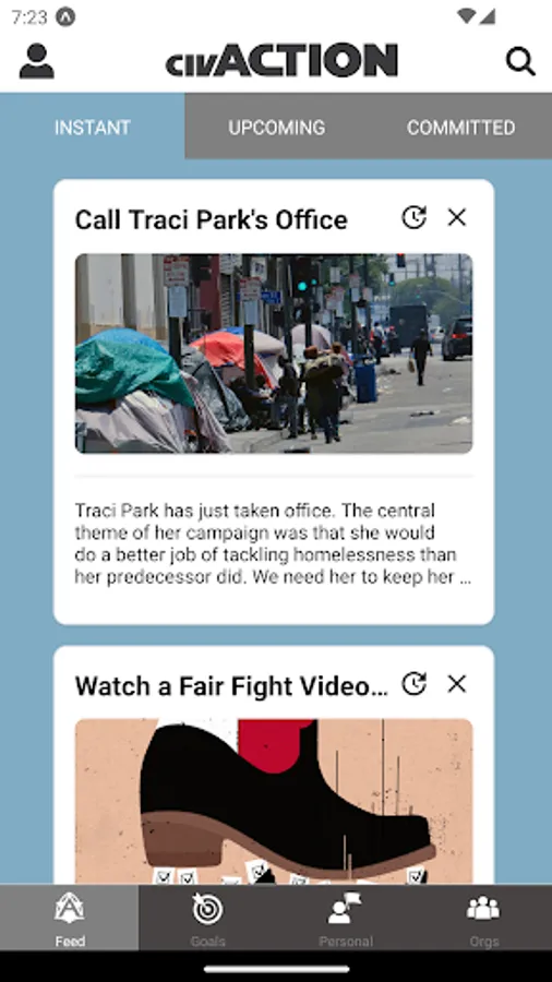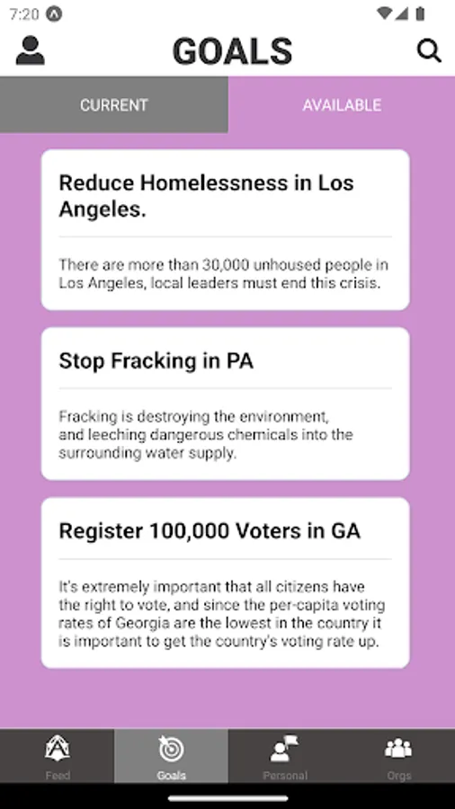 After joining, you will select goals that you wish to help advance. The app will give you a personalized feed of concrete actions that you can take to contribute to positive change aligned with goals about which you are passionate. You will connect with organizations that share your views and they can provide simple ways for you to support their missions. It provides clear, concise instructions that make it easy to participate even if your time is limited.