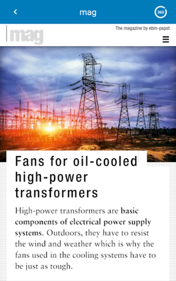 The 360° app is your access to the world of ebm-papst. Whether it’s finding operating instructions, managing fans with an RFID chip, or reading “mag”, the customer magazine, you get an overview of your product-related data and stay informed!
