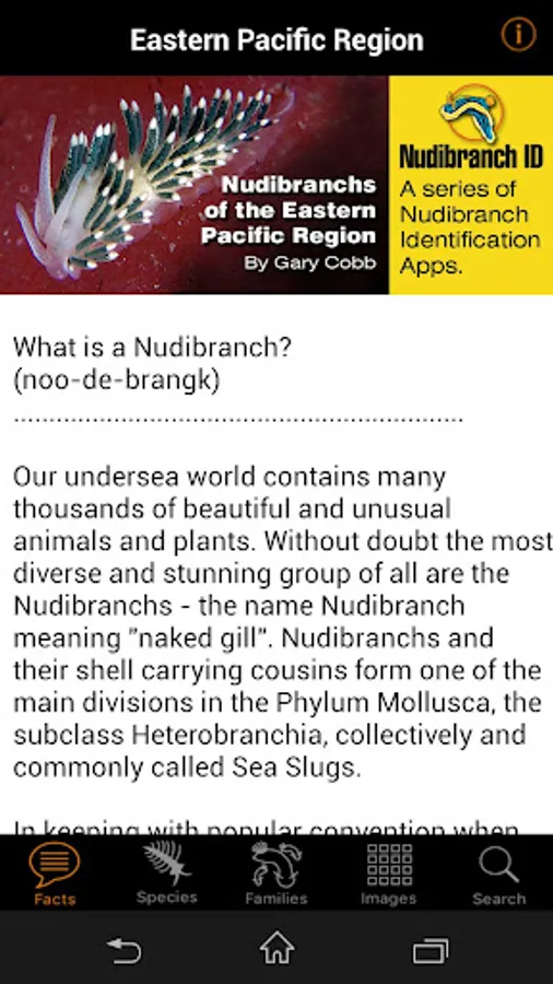 This field guide will place right at your fingertips, anytime and anywhere, an outstanding selection of 442 species of Nudibranch found in the Eastern Pacific Region from Alaska to the tip of Chile in South America, a zone where marine fauna diversity ranges from extreme cold water species to tropical species. No web connection required.