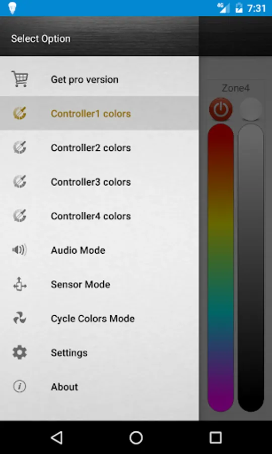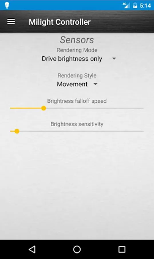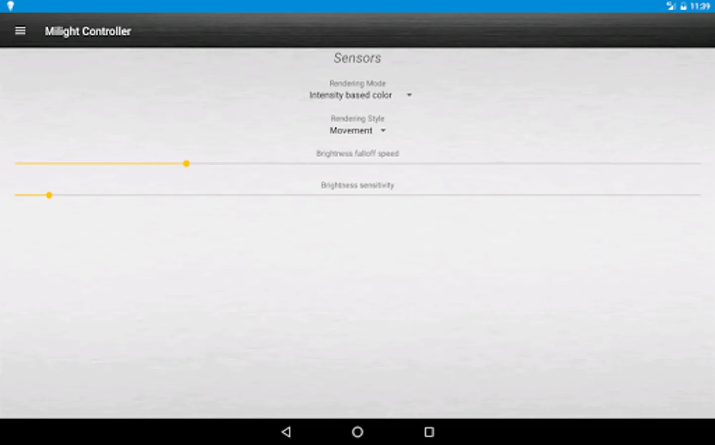 Sensor Mode: (Not available on Android TV) In this mode movement or rotation of your device will produce colors. Your device needs to have an Accelerometer for this effect to work