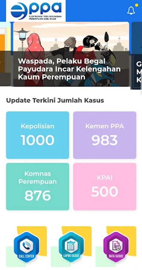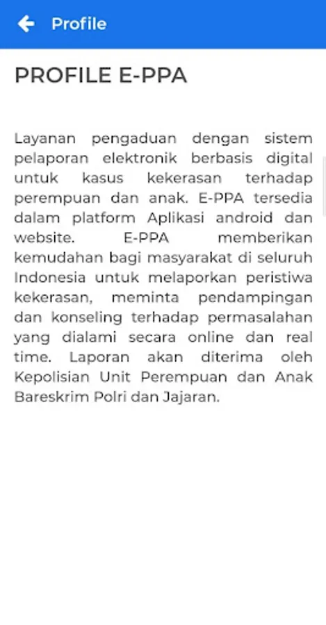 Complaint service with an electronic reporting system for cases of violence against women and children. E-ppa makes it easy for people throughout Indonesia to report incidents of violence, ask for legal assistance and counseling on the problems experienced.