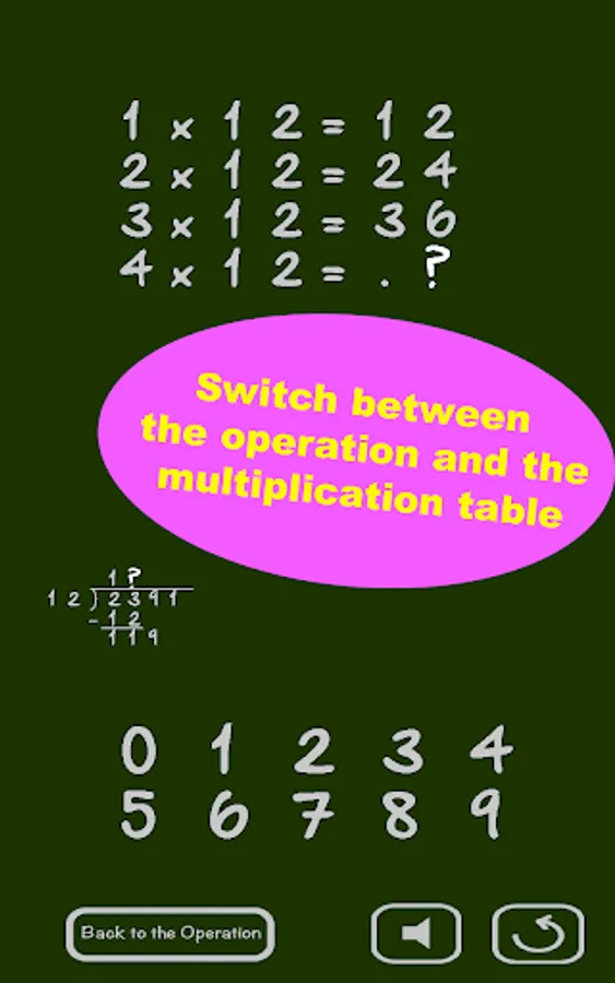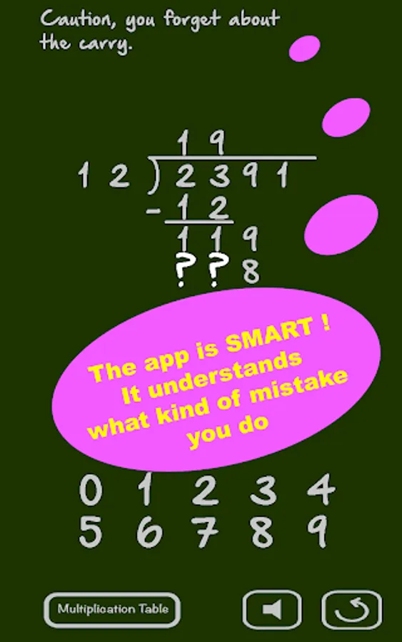 In training mode, you do the long division step by step by yourself. The application detects the mistakes, such as forgetting the carry. It gives you indications if you need all along math exercises.