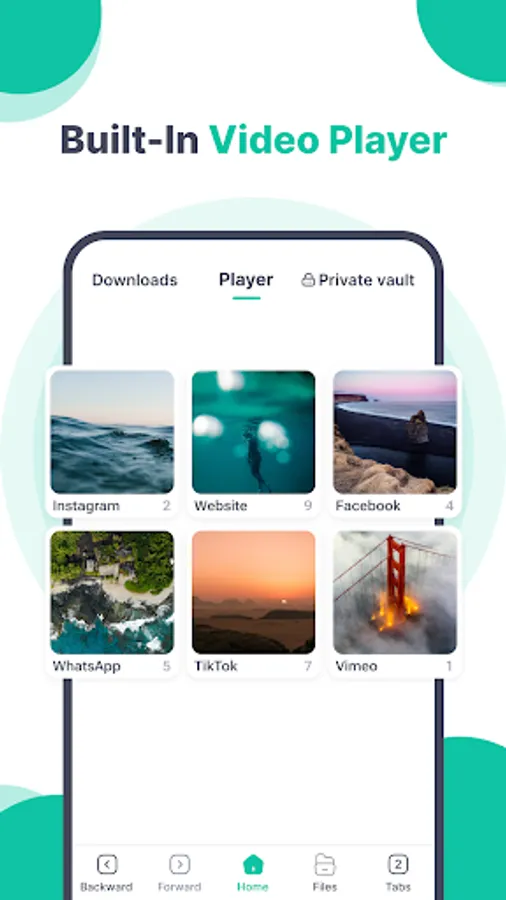 This easy-to-use and 100% free video downloader app allows you to set playing mode, adjust playback speed in a single tap. With its built-in browser and multi-functional player, you'll experience uninterrupted "Download" and "Enjoy" in this video downloader and video saver app. Plus, it's fast, secure, and private. You can even set up password-protected folders to keep your downloaded video files away from prying eyes.