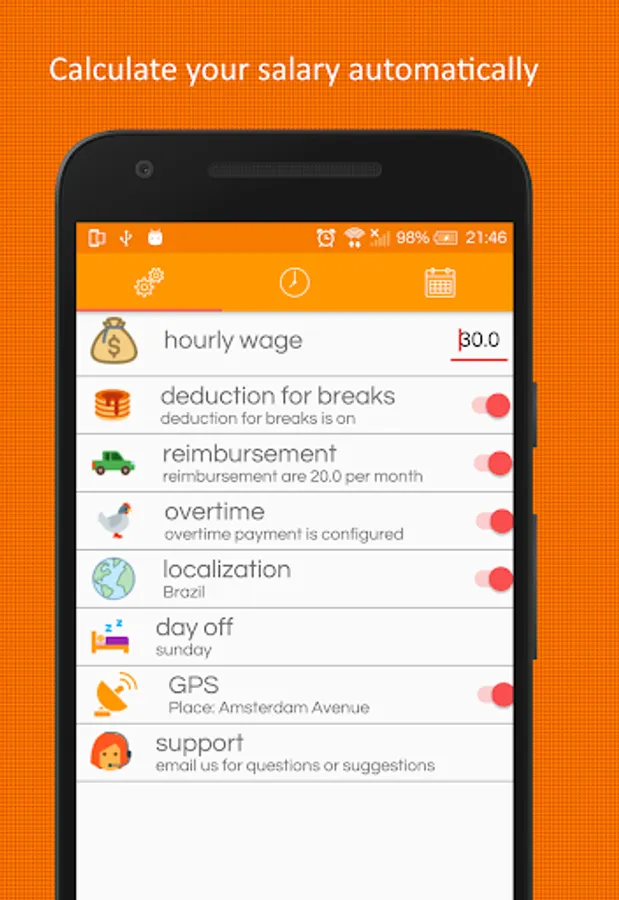 timetracking has never been easier with this timetracker just setup the money for hour, overtime work, salary for holidays work, and use google maps to set place of employment, and know how much money is your salary going to contain.