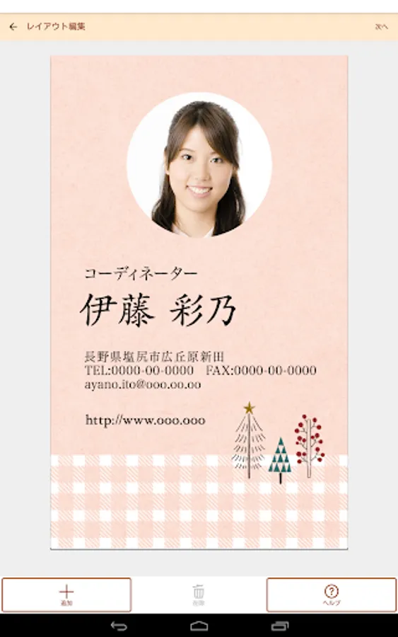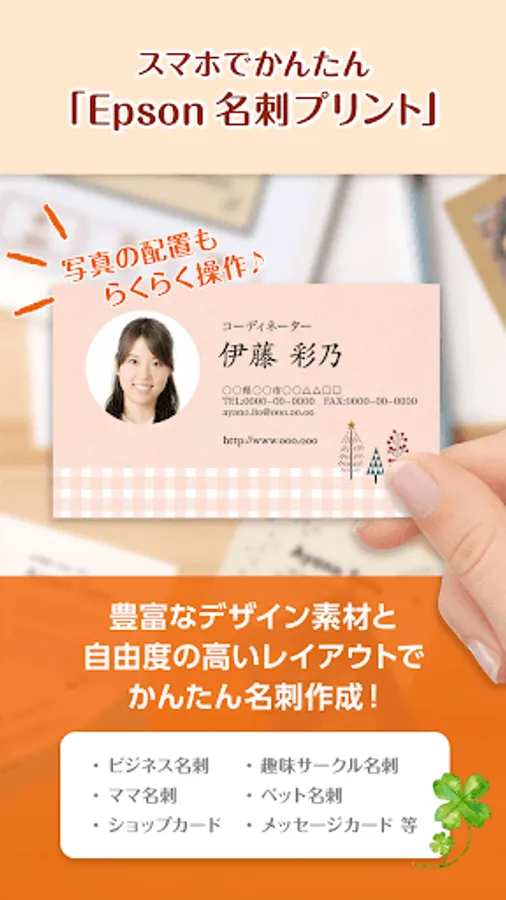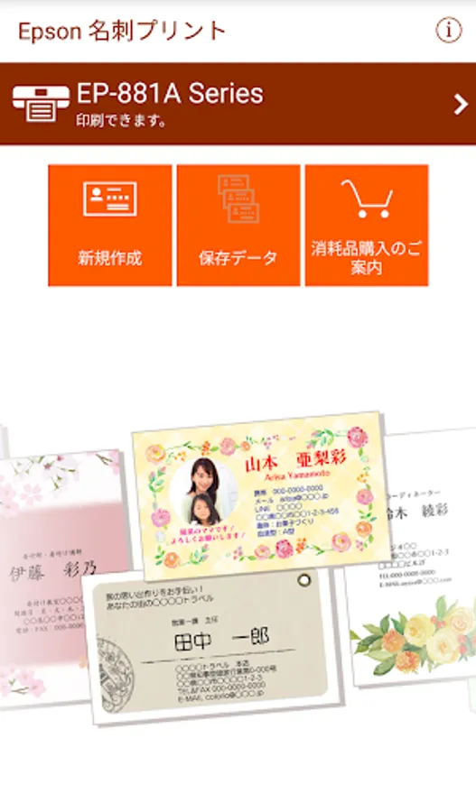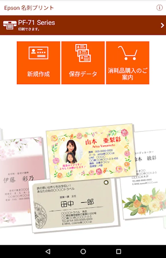 "Business card print" is an application that allows you to easily create business cards with photos from your smartphone or tablet device and print them with an Epson printer.