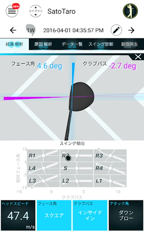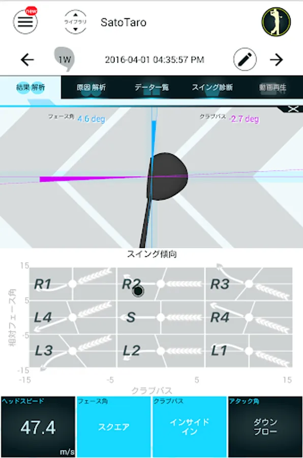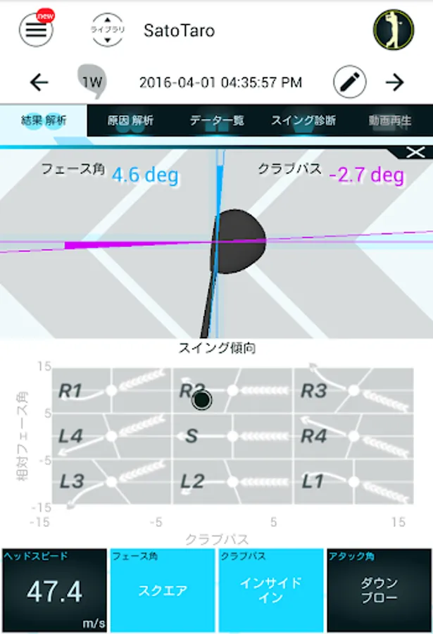 -結果解析 : スイングの3Dビューはもちろん、インパクト時のヘッドスピード、フェース角、クラブパス、アタック角をチェック。わかりやすくなったUIにより、直感的に結果を把握することができます。