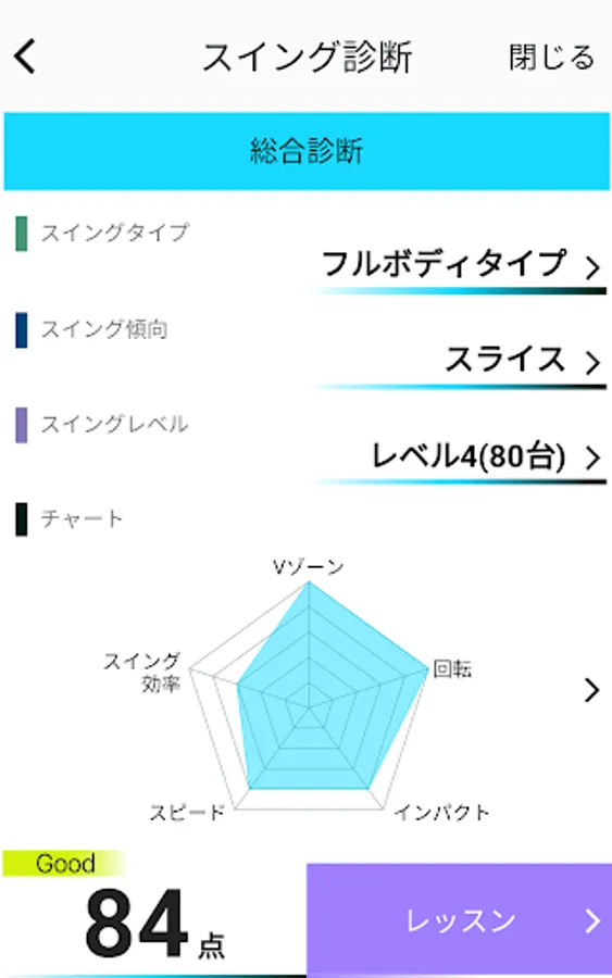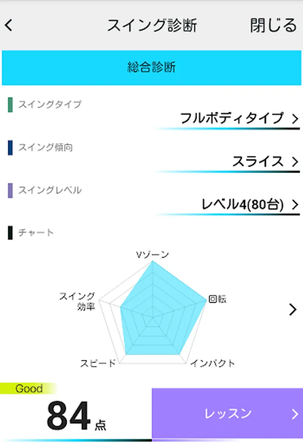 -スイング診断 : 好評を頂いているスイング診断機能をさらに強化。ドライバーだけでなく、アイアン(5~9アイアン)の診断機能を搭載しました。自分のタイプにあった上達を目指すことができます。