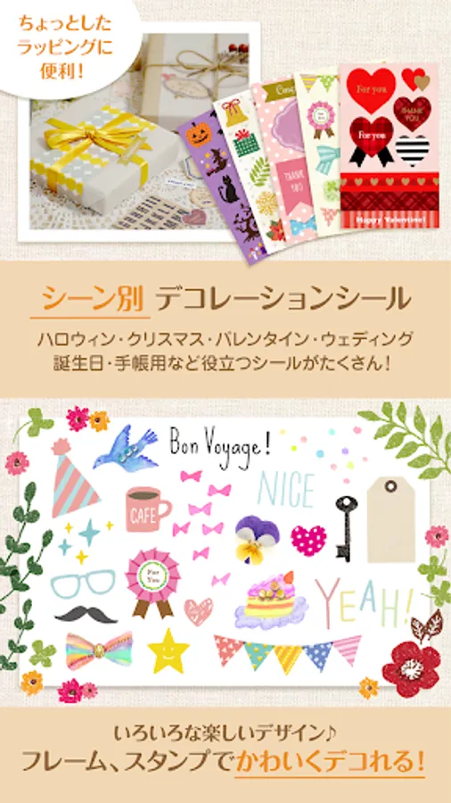 ◇ You can use 657 kinds of design contents (frames, stamps etc.) that colors pictures for free.