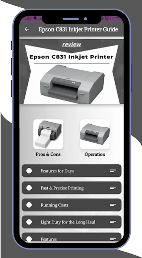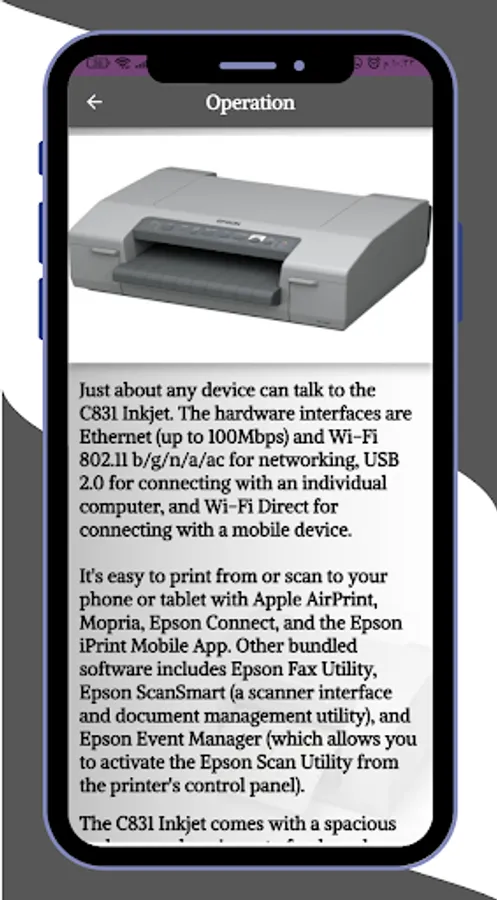 - Epson C831 Inkjet Printer Guide app rich in information and pictures.