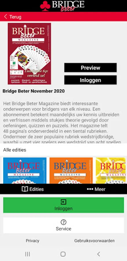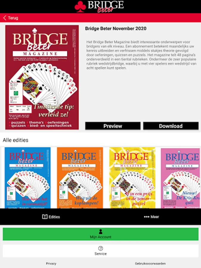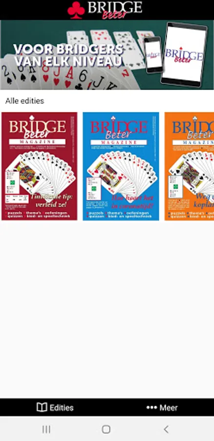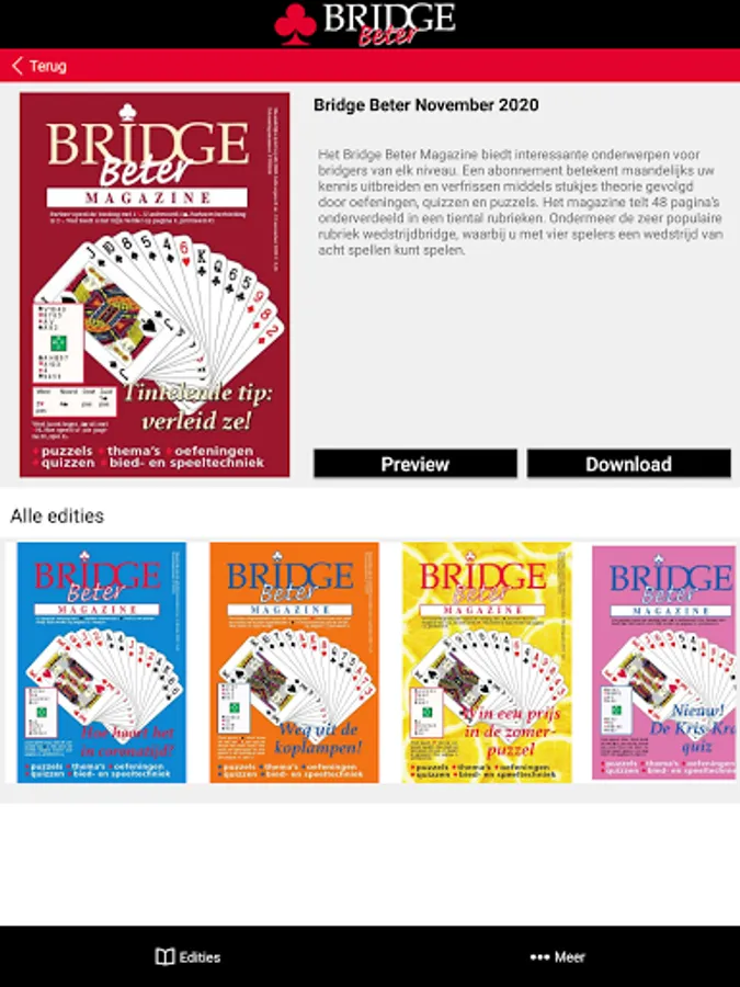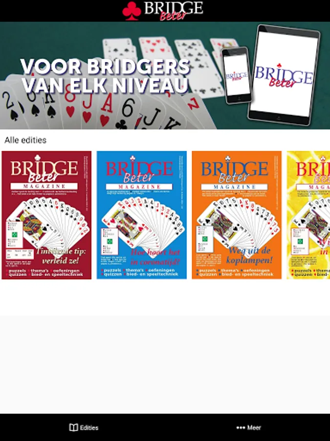 The Bridge Beter Magazine offers interesting subjects for bridge players of every level (green for beginners, blue for intermediate and red for advanced students). A monthly subscription means expanding and refreshing your knowledge through pieces of theory followed by exercises, quizzes and puzzles. The magazine has 48 pages divided into ten sections. Among other things, the very popular competition bridge section, where you can play a game of eight games with four players. On all games you will receive extensive comments from Berry Westra (editor-in-chief) and a frequency-state.