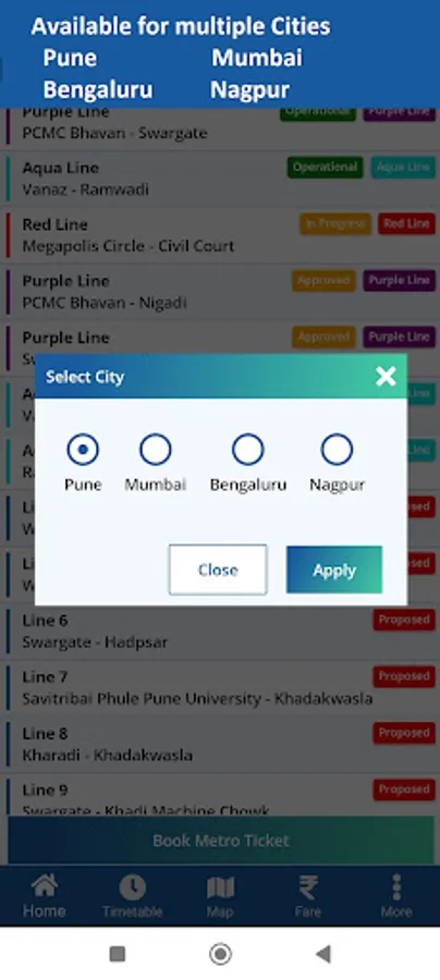 Pune Metro, Mumbai Metro provides access to Mumbai Metro, Pune Metro, Bangalore Metro, Nagpur Metro train schedule in most convenient manner.
