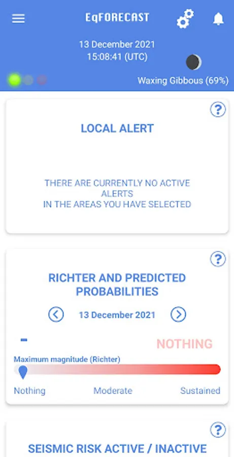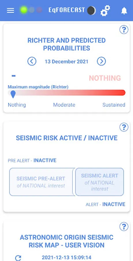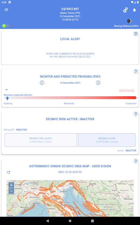 Once registered and logged in, with the FREE default version the user can view the seismic risk prediction in the 2 dimensions of the seismic risk time and the maximum expected magnitude (Richter) in the App home, but you will not yet be enabled to prediction of the location at risk (possible epicenter), nor upon receipt of sound notifications of pre-seismic alerts.