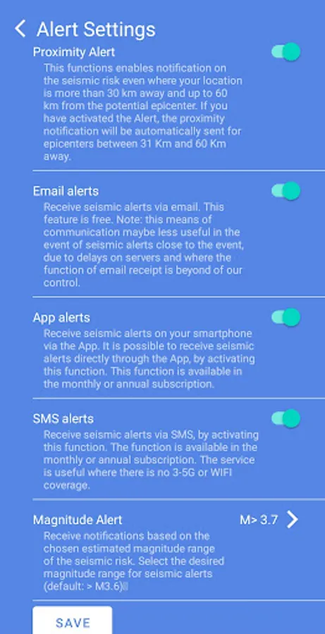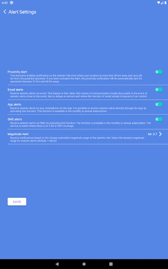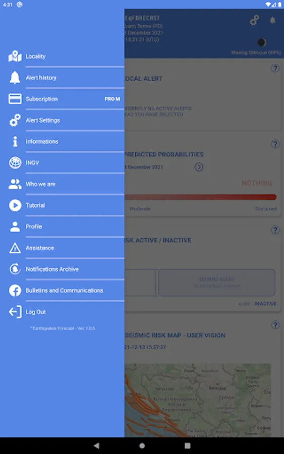 The functions of receiving pre-seismic sound alerts ("lifesaving" alert) and indicating the potential epicentral location of the future earthquake require the subscription to the BASE or PRO subscription for a fee, but it is possible to take advantage of a trial period of 30 free of charge. days.
