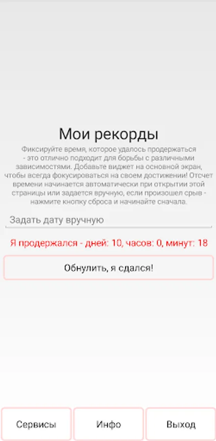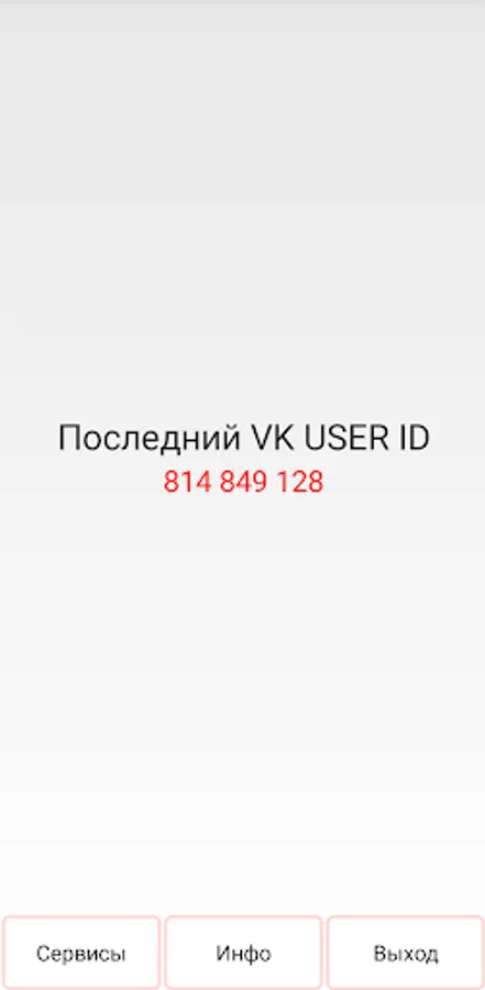 The application allows you to use the services of the social network VK, as well as set your own records - to unlearn addiction. VK services - a service is available to show the last user ID in this social network, which will allow you to find out the last VK USER ID and register a VK page with an approximately calculated beautiful ID. Records service - you can fix the time and see how long you lasted, and for the main screen there is a widget with this information so as not to forget about your achievement.