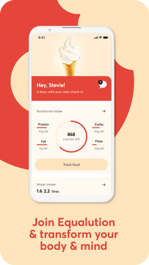 The Equalution App allows you to submit your weekly check in, any food preferences you may have for your meal plan, chat to your coach and reach out for support or assistance when it comes to tracking your food and meeting your daily targets with food of your choice. Track your water intake and conveniently shop for your meal plan with your grocery list.