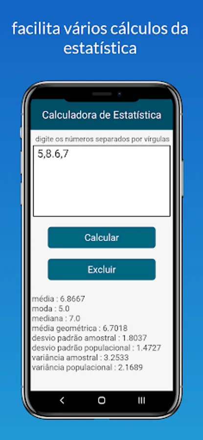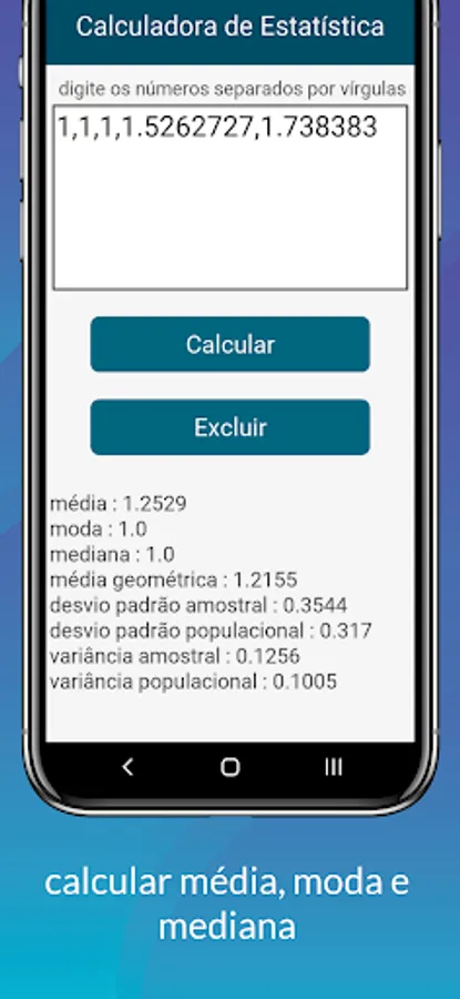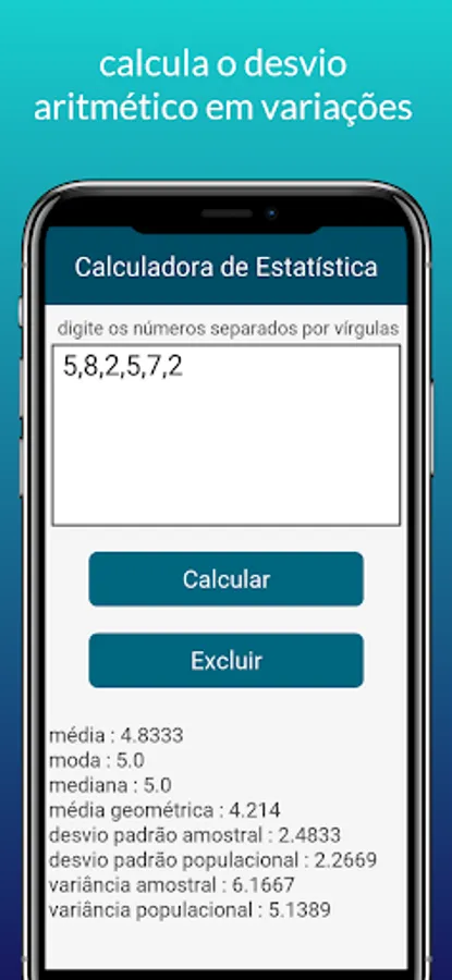 In this calculator you can find tools that help with statistical calculation in the areas of mean, mode and median, variation, standard deviation, arithmetic precision, among others...