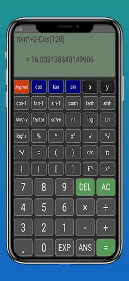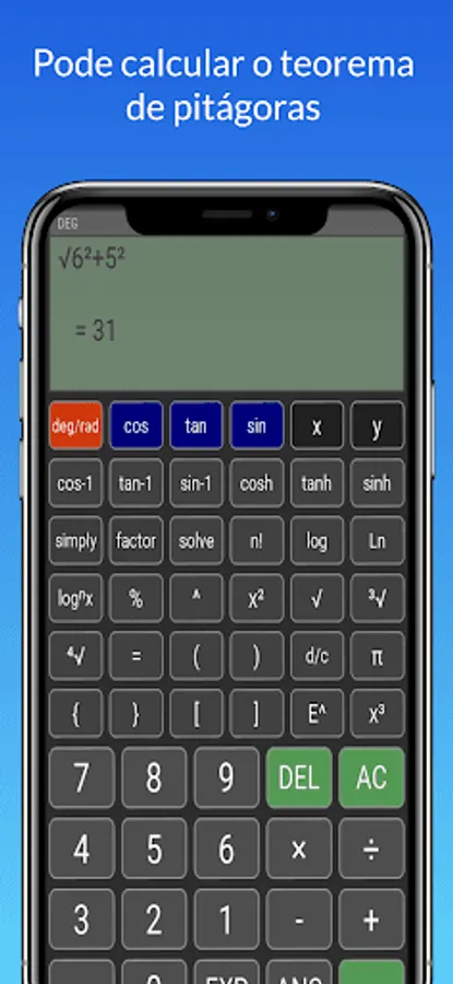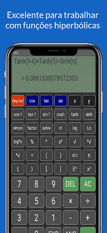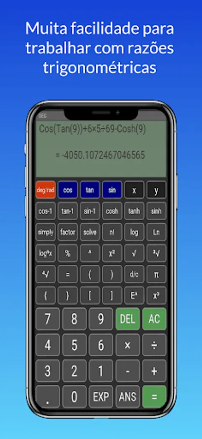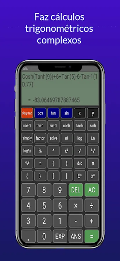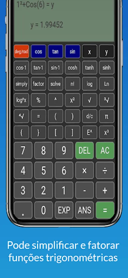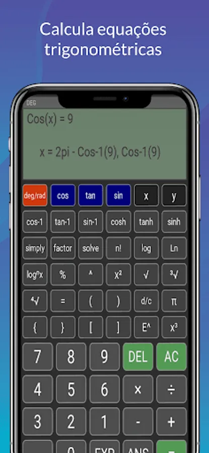 The trigonometry calculator is not restricted to the area of trigonometric science, as it has several algebraic functions to calculate various types of equations, in addition to having functions in the areas of combinatorial analysis, being able to calculate combination and permutation, in addition to being able to perform calculations in other areas of exact sciences such as physics, geometry, statistics and arithmetic...