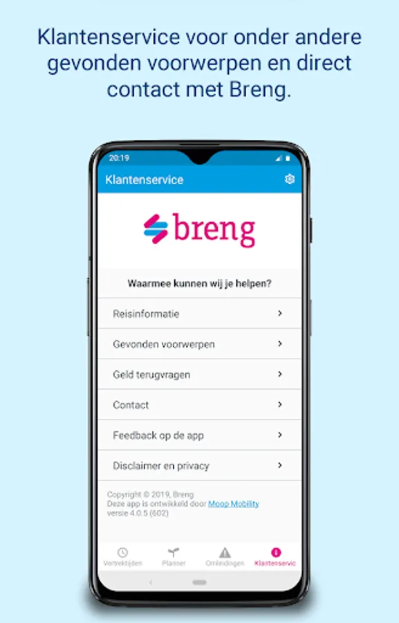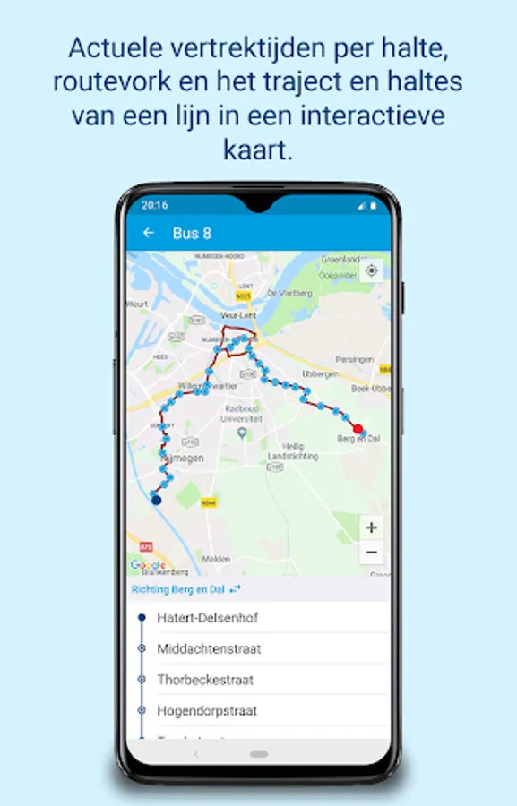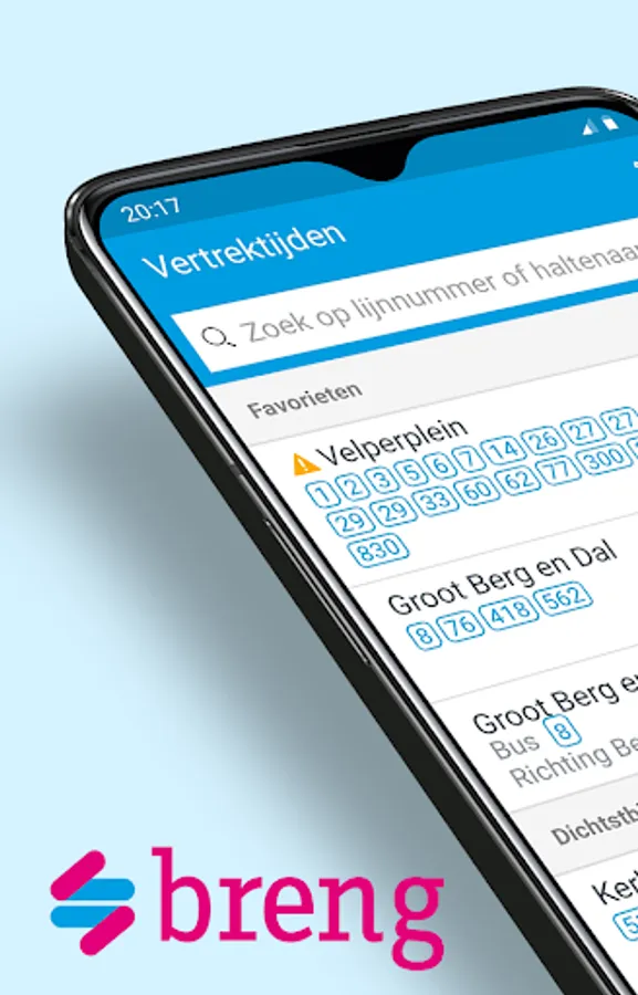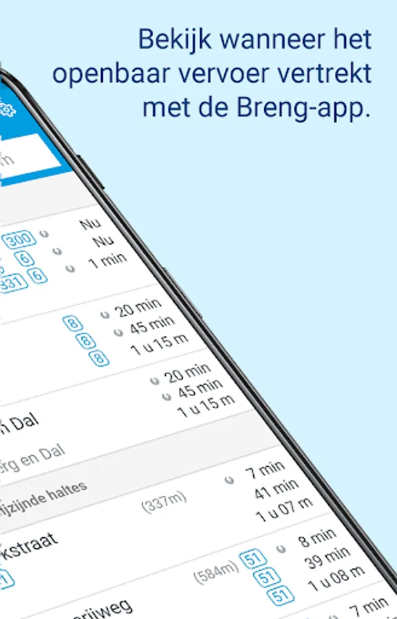With the Breng OV App you have current departure times at hand. Using your GPS location, the app determines which stops are close to you. You can immediately see if your ride is leaving on time.