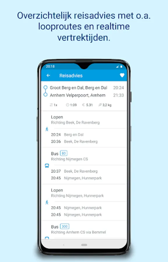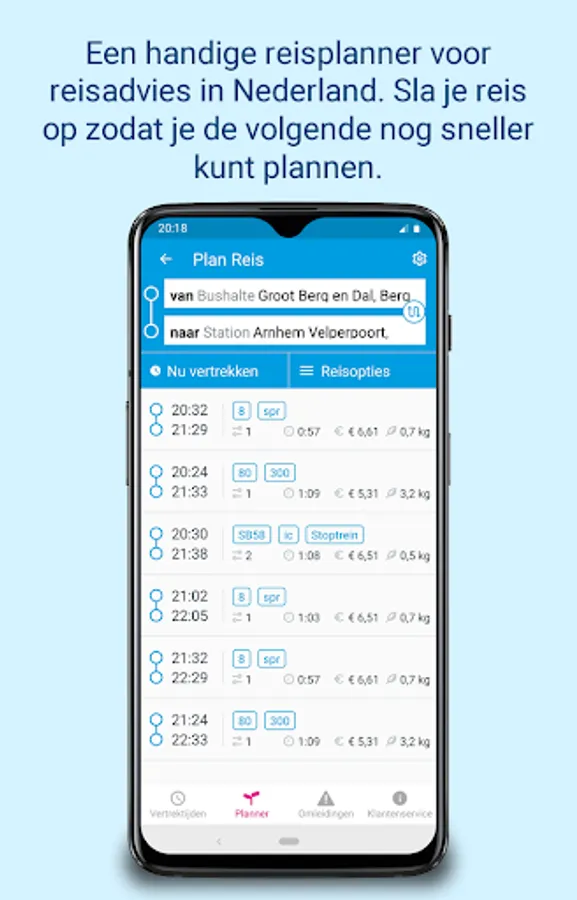 With the travel planner you can request travel advice from your current location or your chosen address to every travel destination in the Netherlands. For bus, tram, metro, train, ferry and walking.