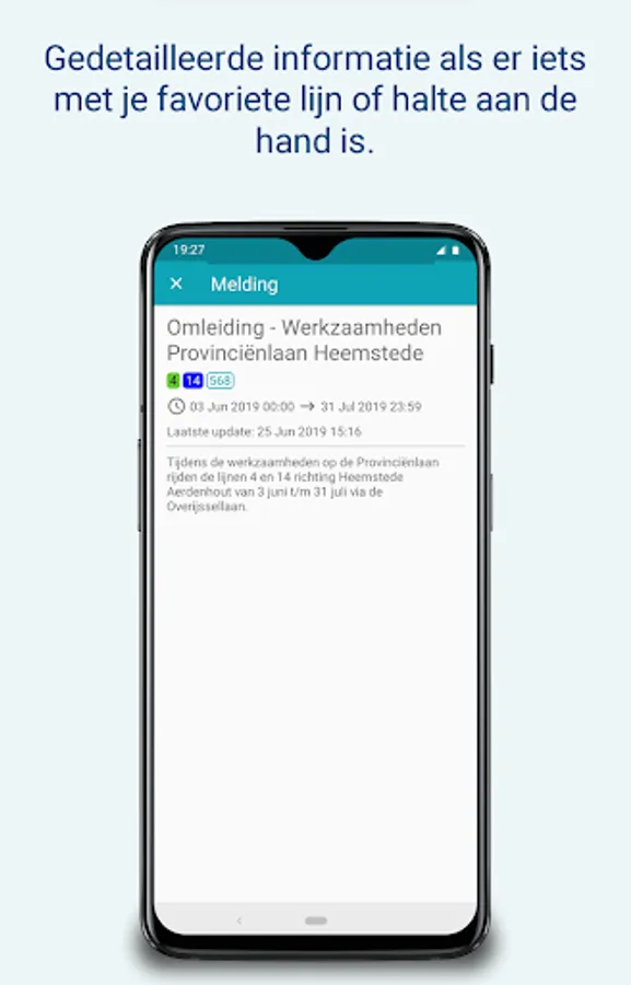 You can set stops or bus lines as favorites in the App. You can indicate per bus line whether you want to receive a notification for current travel information (about detours and blockages, for example). You can set this per line, per day and per time slot.