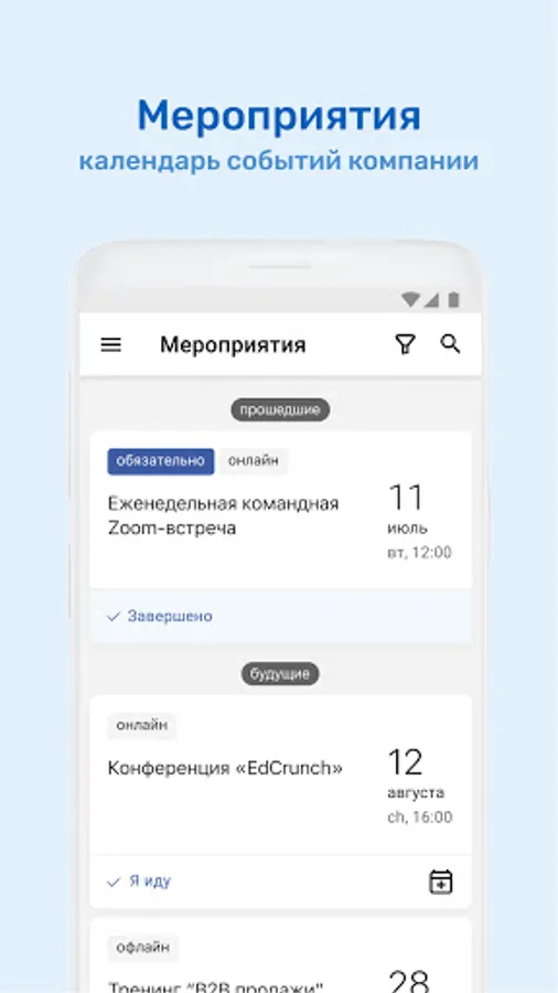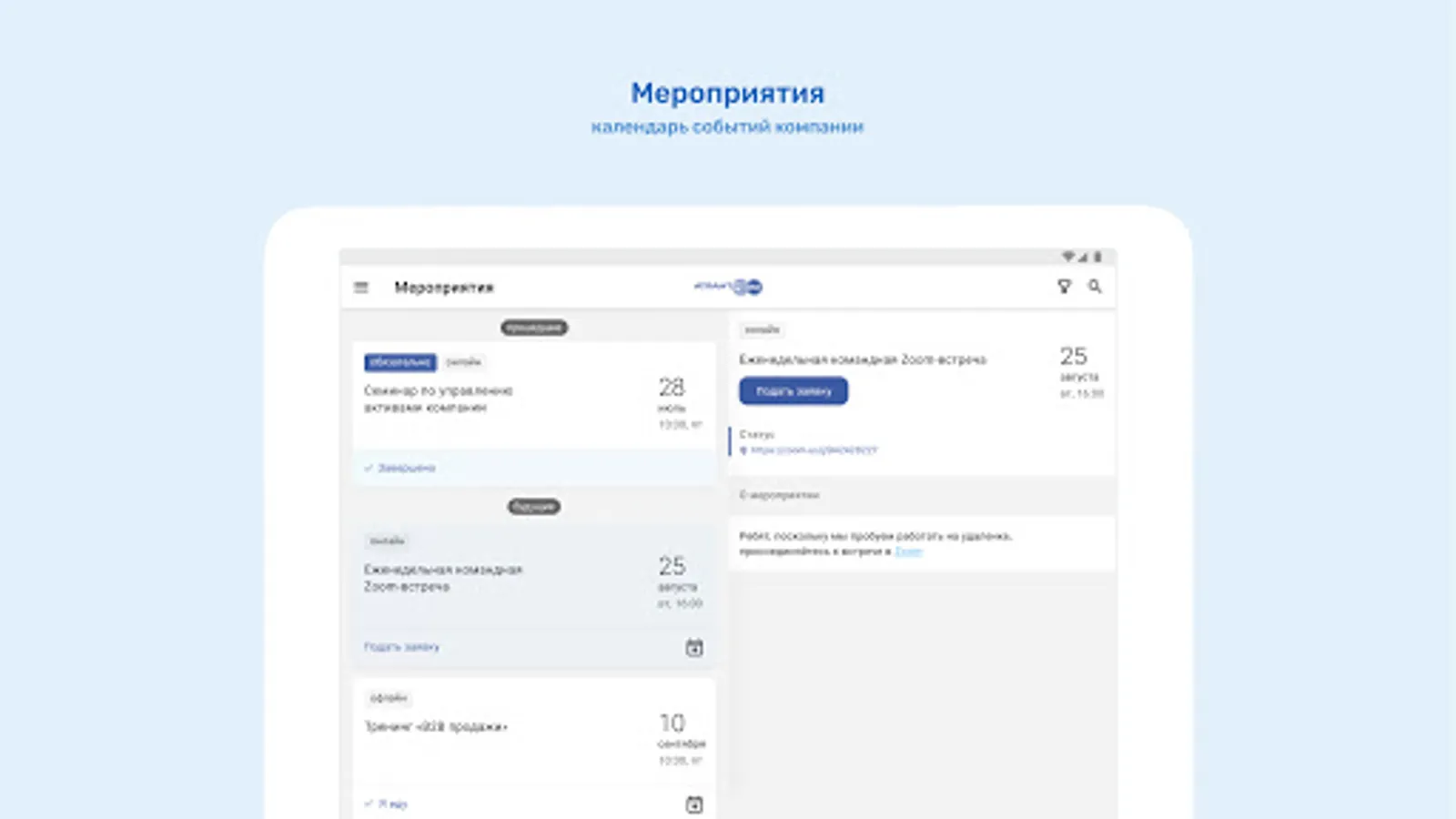 ⁃ Calendar of corporate events with the ability to apply for participation