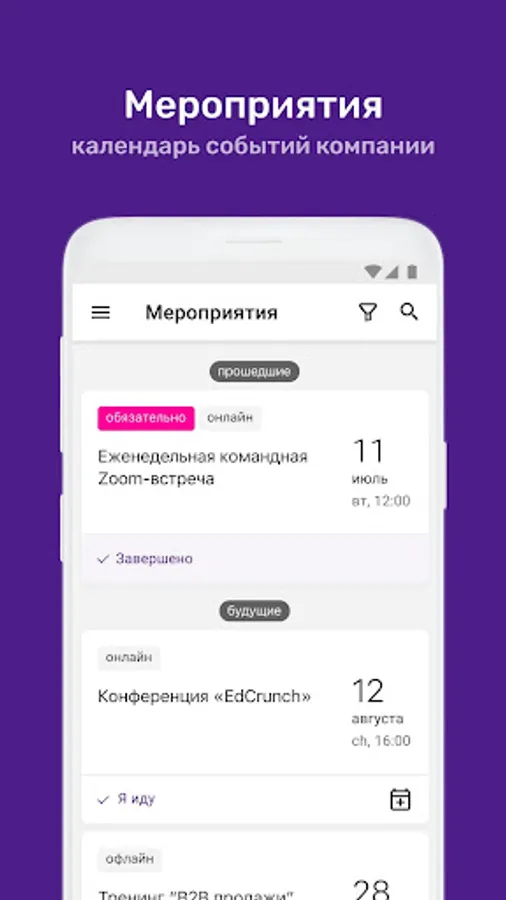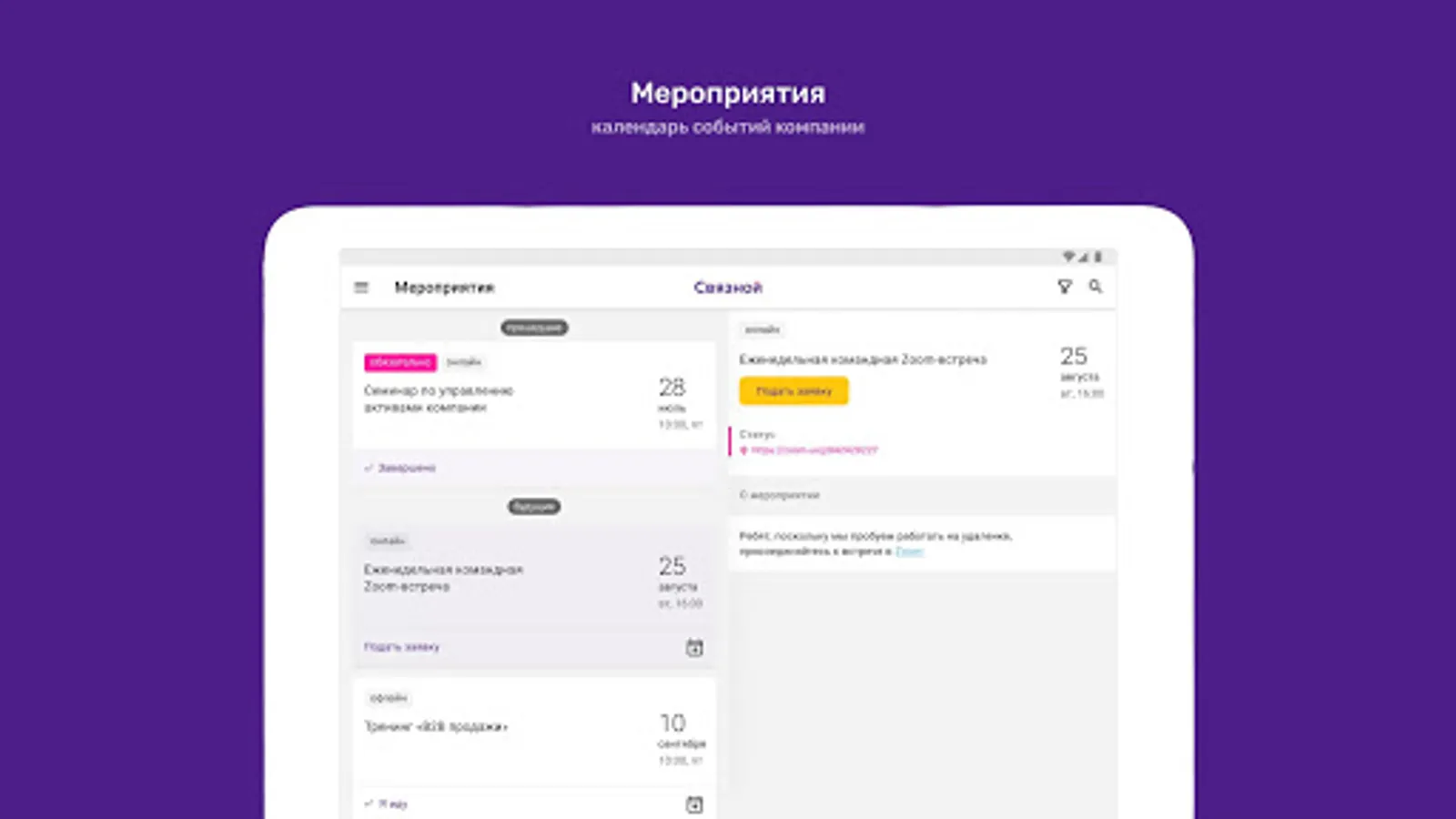 ⁃ Calendar of corporate events with the ability to apply for participation