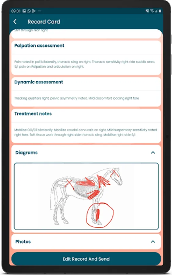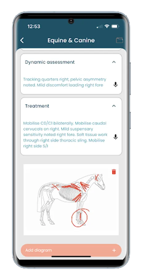 You can create easily accessible digital records, features including digital diagram markup from a selection of anatomy diagrams, voice note upload and photo storage. You can also send an edited version of your records directly to clients where it will appear in the Equigate client app.