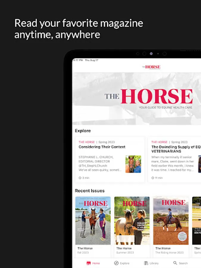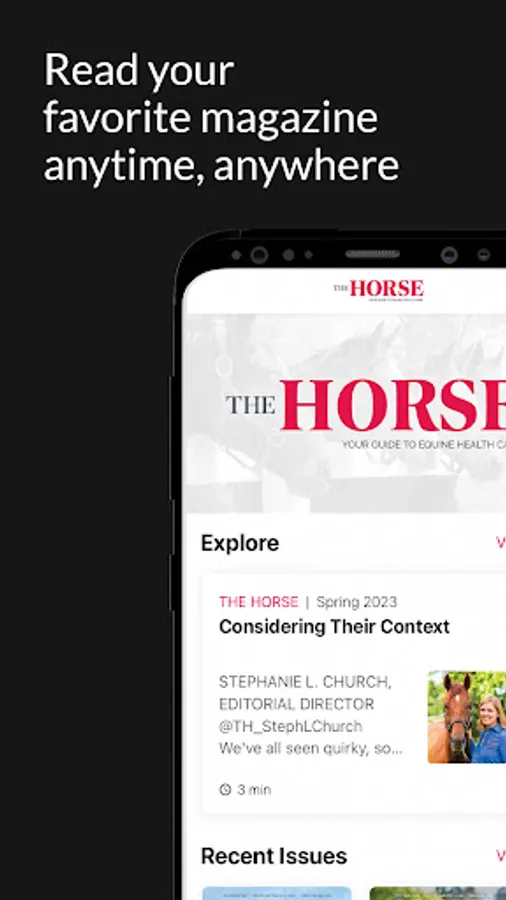 The Horse is concerned with all aspects of equine health, and it is written for hands-on horse owners, trainers, riders, breeders, and barn managers who want to know more about taking the best care of his or her horses. Provides health information for horses of all breeds and disciplines.