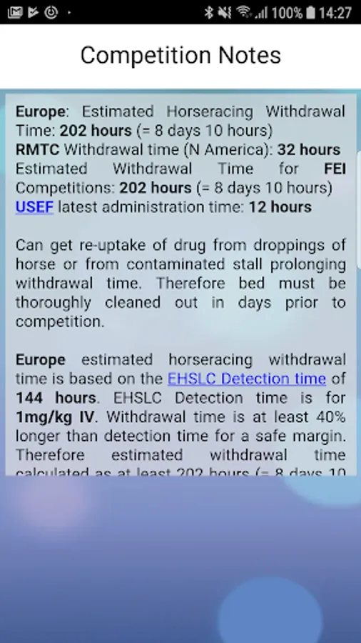 • There are notes on use in competition, including detection times published by the FEI, RMTC, EHSLC and USEF.