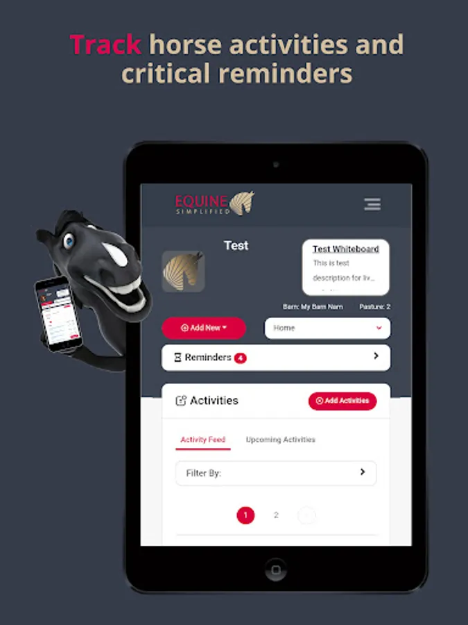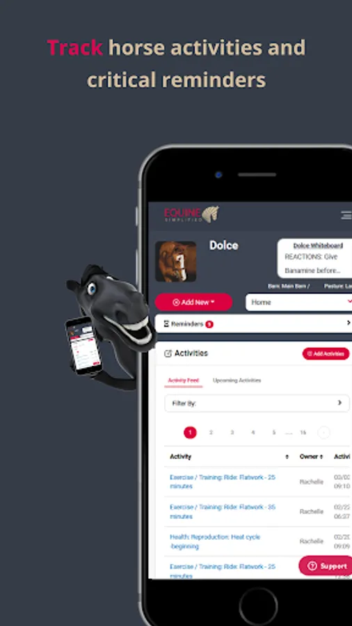 • Add one time and recurring reminders. Checking off reminders automatically adds the activity to the horse’s history