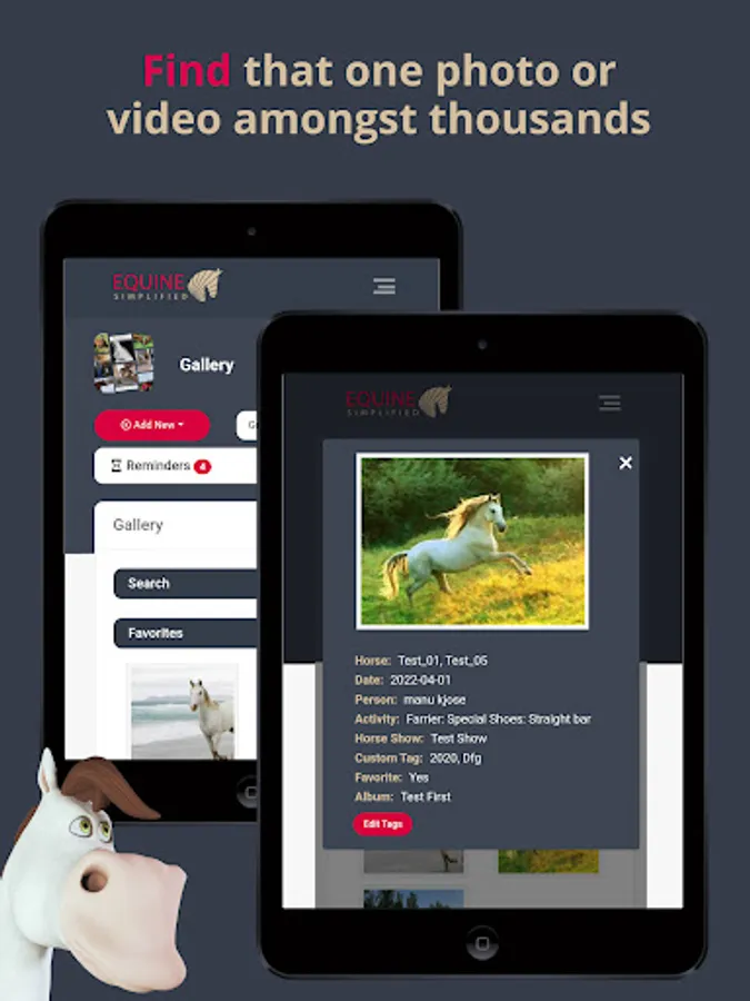• Search to find “the one”. Search from horse, date, person, activity, horse show, custom tags, favorite and album